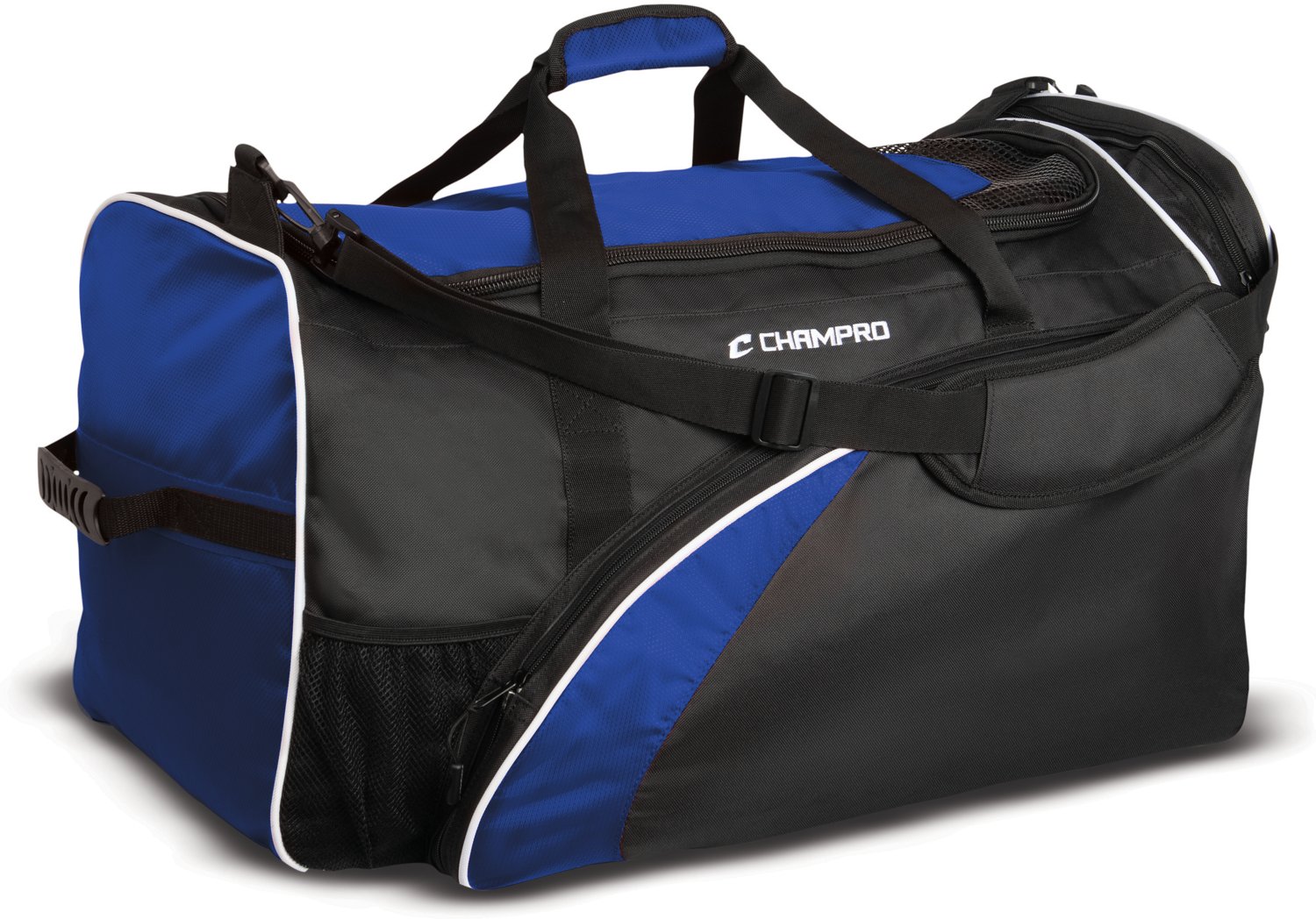 Fit all your bulky football gear in the Champro Varsity Football Equipment Bag. This oversize bag offers ample storage for large shoulder pads and a helmet, and the water-resistant exterior offers durable protection. Side pockets stow accessories, and a ventilated compartment lets your cleats breathe. Wrap-around handles and a padded shoulder strap make carrying a breeze.