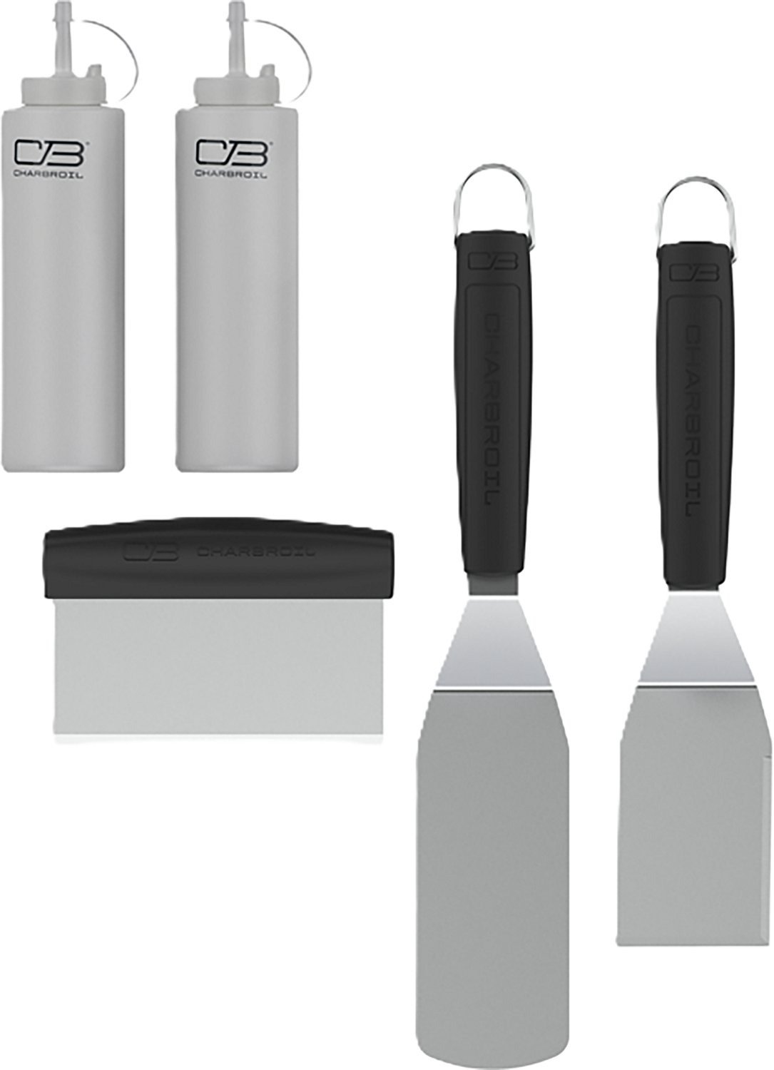 Whip up your favorite eats on the flat-top using this Charbroil Aspire 5-Piece Griddle Tool Set. The included spatula and turner let you flip burgers and pancakes and toss stir fry with ease, while the chopper/scraper both allows effortless slicing and dicing of ingredients galore and enables effortless cleanup. Two multipurpose squirt bottles store water, oil, marinades, sauces and other must-have cooking fluids.