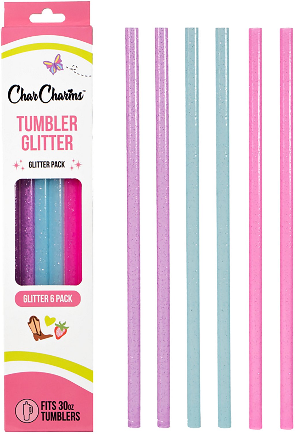Stay hydrated with the CharCharms 30 oz Glitter Straws 6-Pack. The reusable build is best used for 30-ounce tumblers, and the glitter design adds a fashionable touch. The straws are dishwasher safe for easy cleaning.