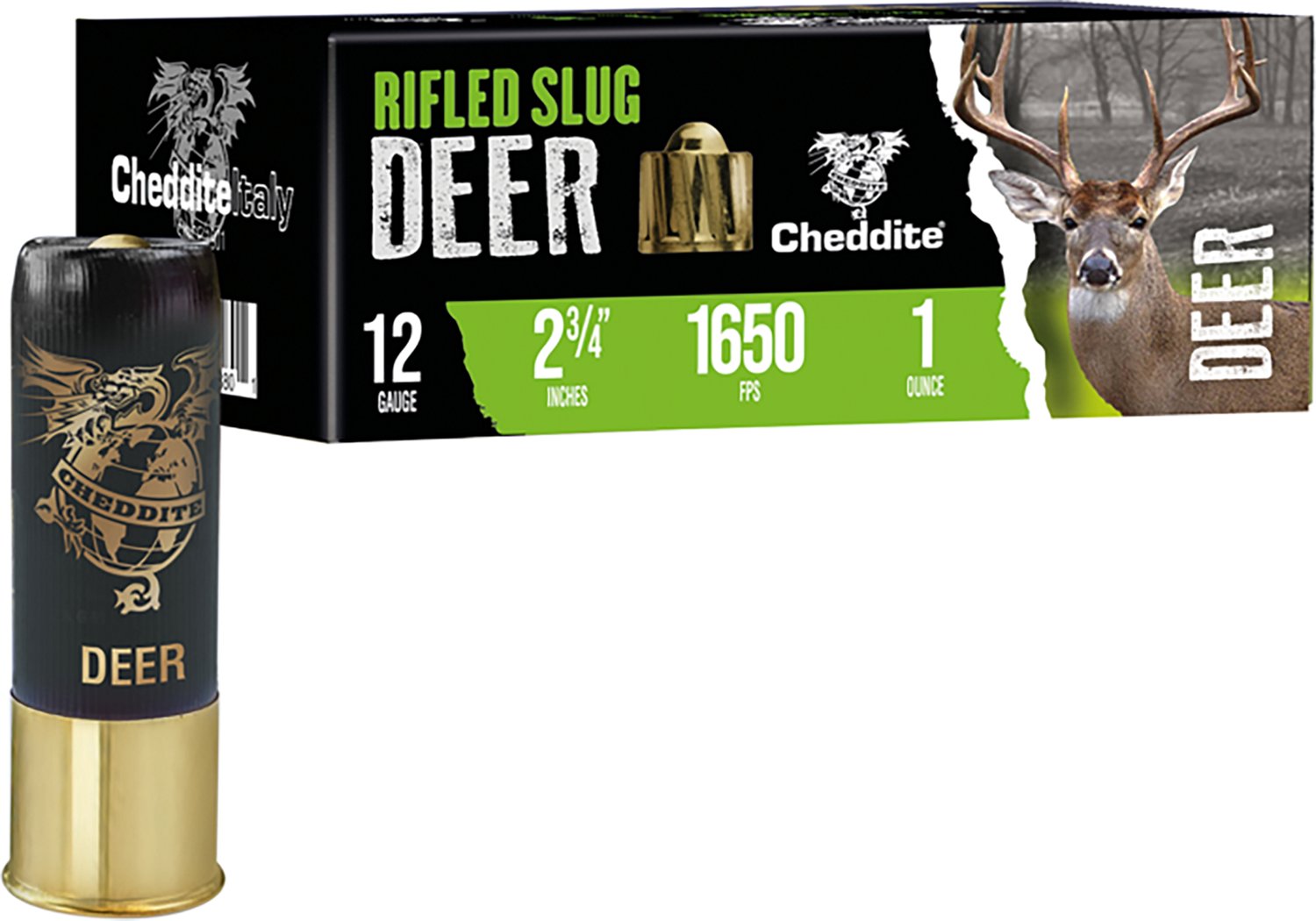 The Cheddite Rifled Slug 12 Gauge Shotshells - 10 Rounds measure 2-3/4-inches in length and feature a rifled slug shot size. They have a velocity of 1,650 FPS and come in a 10-round box.