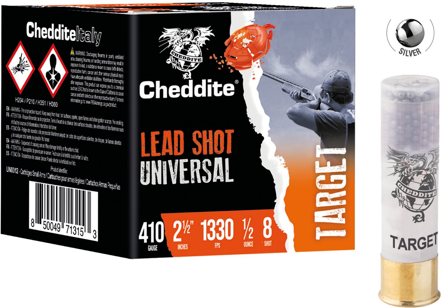 Designed for target practice and quail and dove hunting, the Cheddite Target .410 Bore Shotshell is made of lead. It has a 2-1/2-inch shell, a 1/2 ounce shot weight and an shot size of 8.
