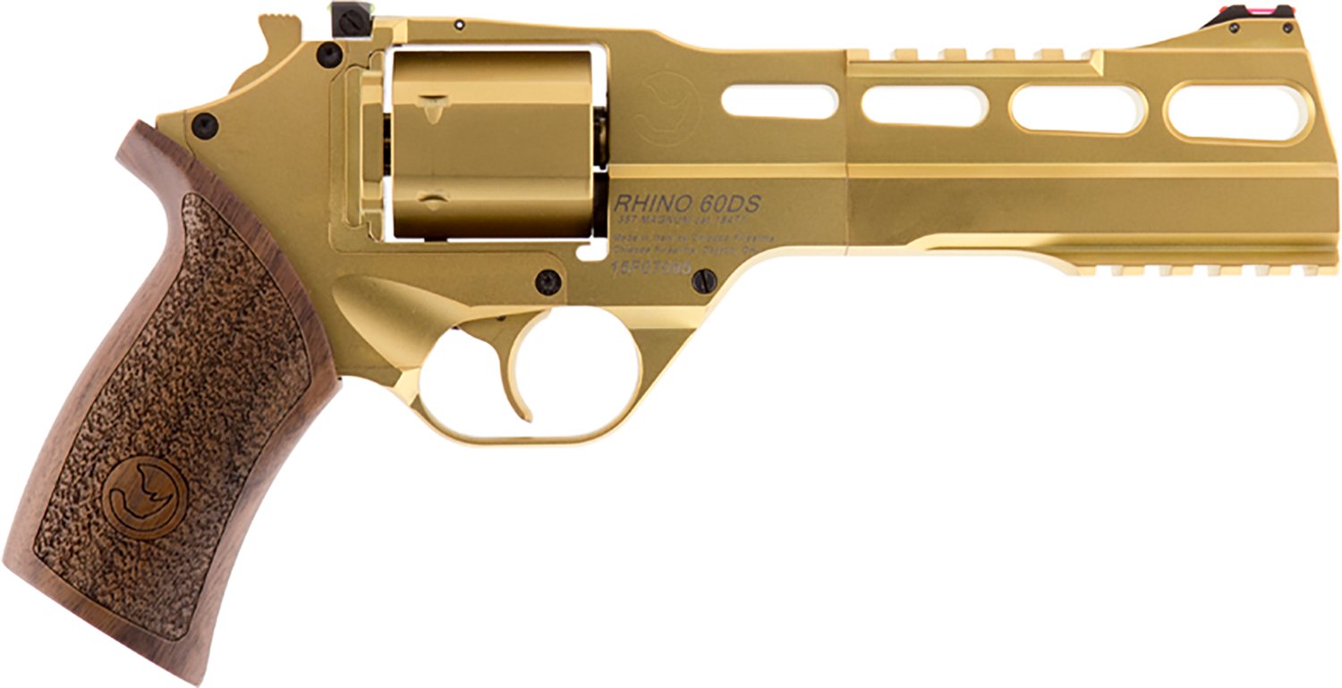 The Chiappa Firearms Gold Rhino 60DS 357 Magnum/38 Special Single/Double-Action Revolver is great for any recreational shooting application. Made with an alloy frame with an applied finish, this revolver comes with walnut wooden grips. The revolver also features three moon clips.