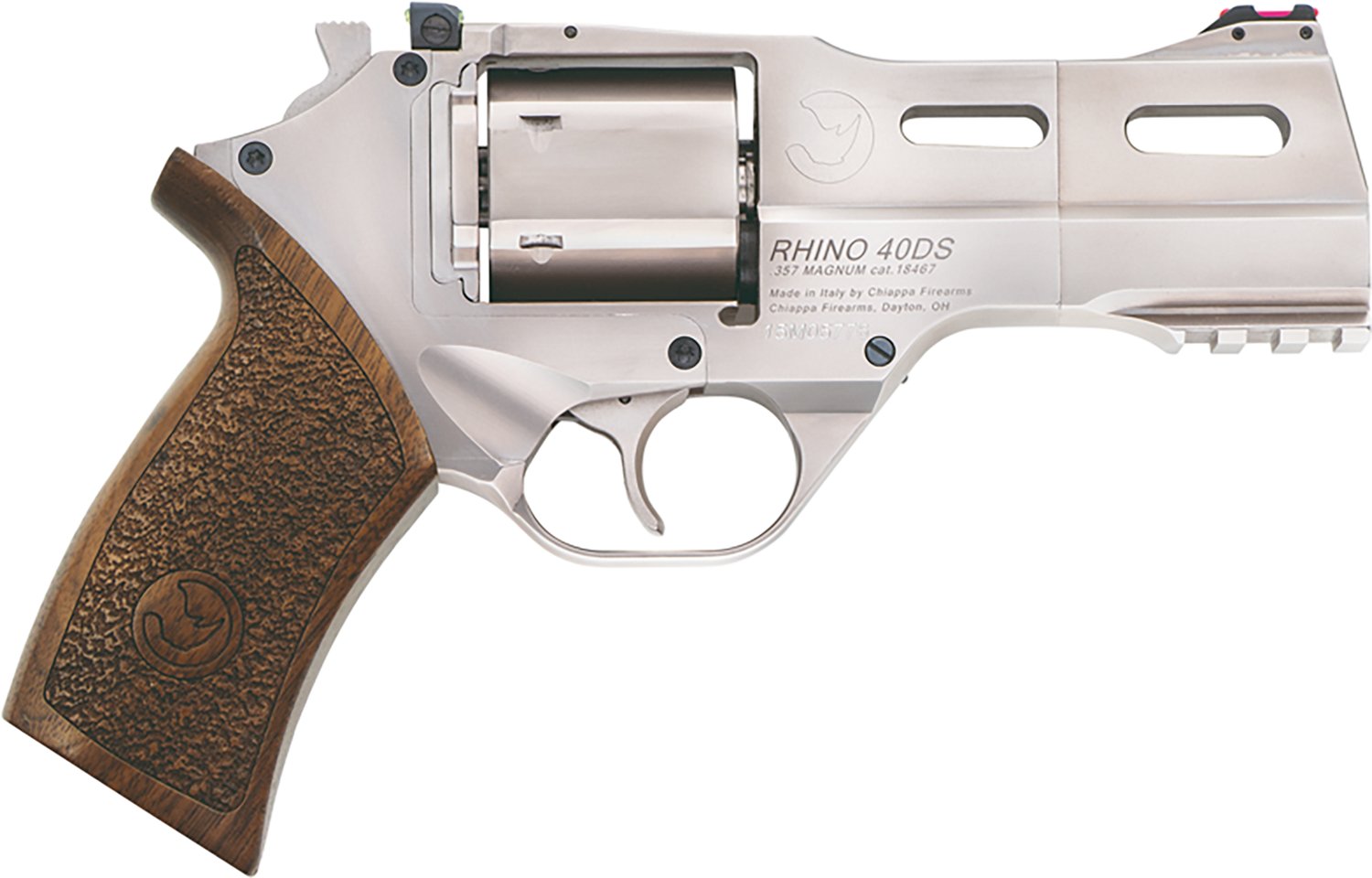 The Chiappa Firearms Rhino 40SAR .357 Magnum Revolver is a single action revolver with a nickel-plated frame and walnut grips. Its steel barrel features a low bore axis and comes equipped with a fixed fiber optic front sight and an adjustable rear sight.