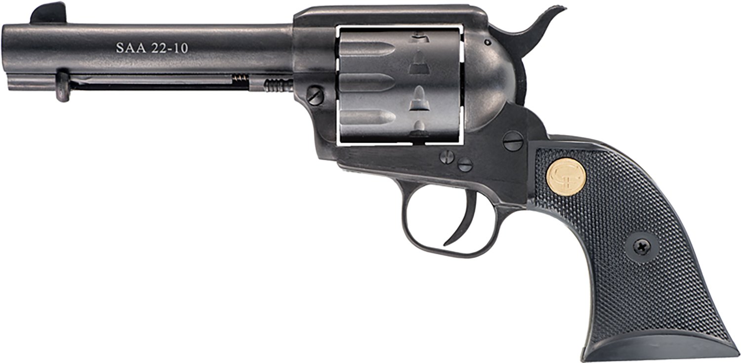 The Chiappa Firearms SAA 1873 .22 LR Single Action Revolver holds up to 10 rounds. It's made from blued steel and is designed for plinking. The revolver comes equipped with a fixed front sight.