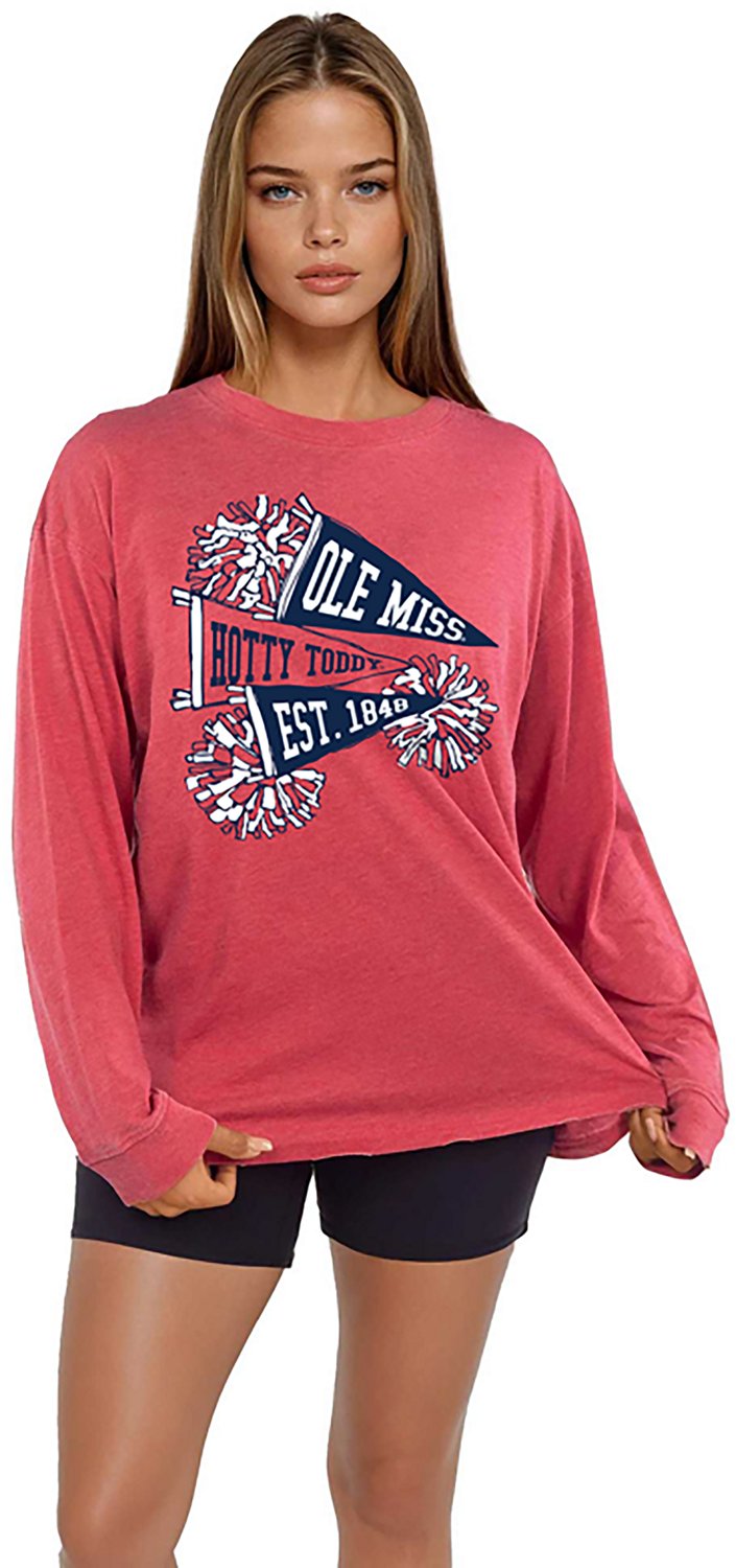 Put your fan pride on display when you wear the Chicka-d Women's Ole Miss Pom Pom Timeless Long Sleeve T-shirt. The cotton and polyester construction provides comfort and durability, while the screen-printed team graphic showcases your fandom.