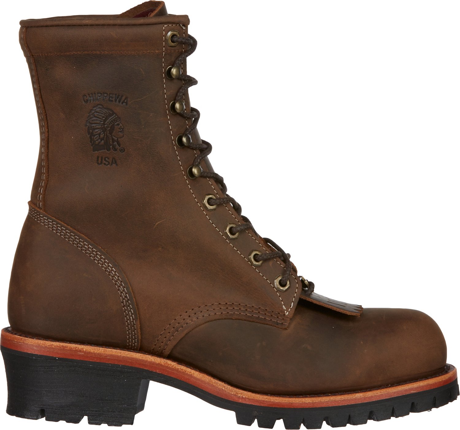 Protect your feet on your next hiking or hunting excursion with the Chippewa Boots Men's Apache Utility EH Steel Toe Lace Up Work Boots. Designed with steel toes and fiberglass triple-ribbed shanks for great support, these boots feature Vibram® 109 logger outsoles for great ground grip and exceed ASTM F2413-11 and ASTM EH rated safety standards. The rugged leather uppers offer a crisp, clean look. 8" boot height.