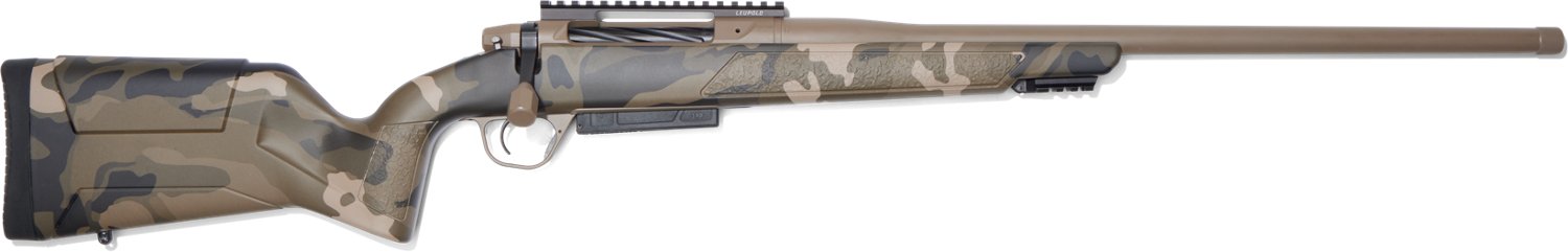 Head into the field with the Christensen Arms Evoke 300 Win Mag Bolt Action Rifle. The threaded barrel has a 22-inch length, and the stock has a camo pattern finish.
