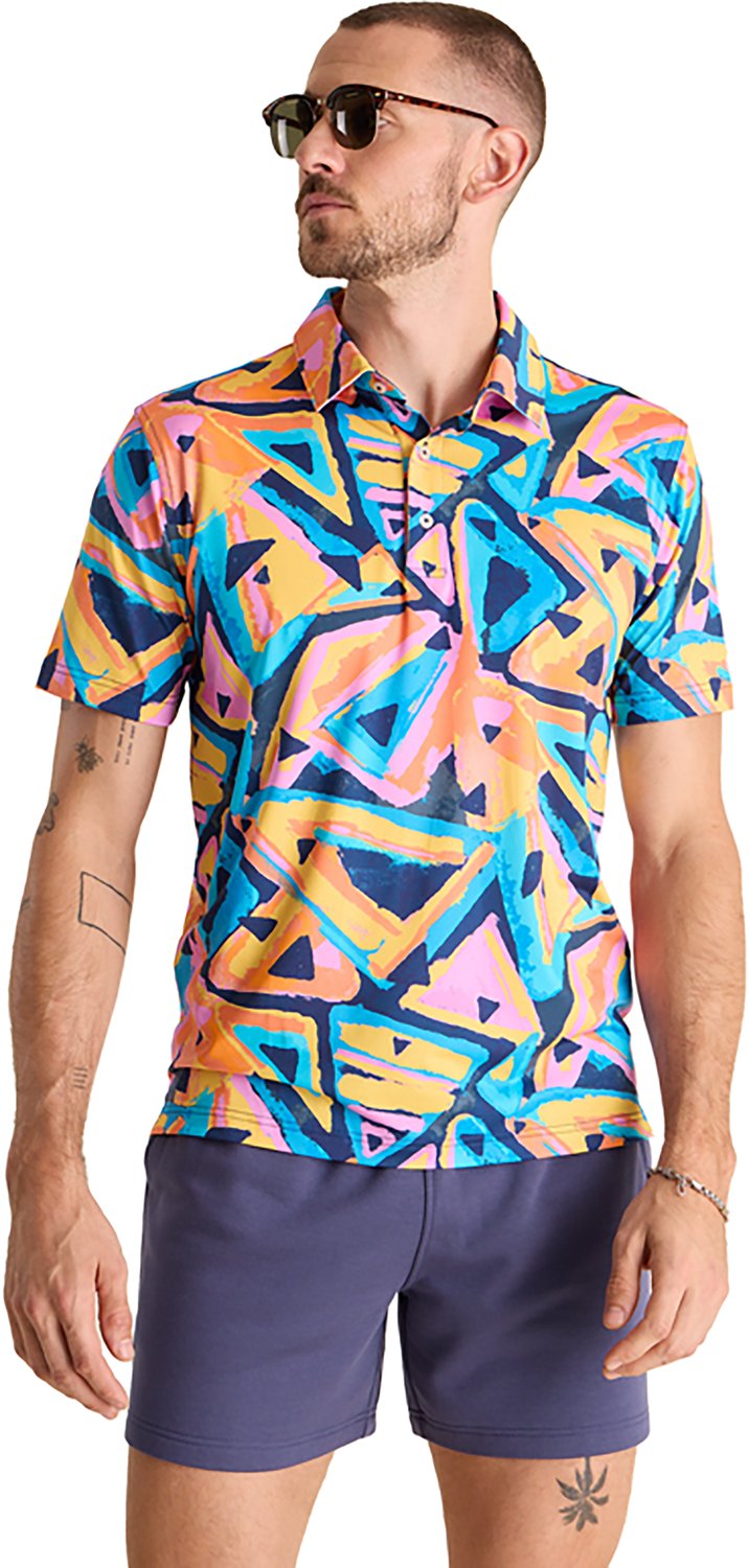 Maximize time out in warm weather with the Chubbies Men's The Exploding Nacho Performance Polo Shirt. Polyester and spandex form a stretchy material for a relaxed feel, and the fabric's moisture-wicking capability keeps skin surfaces dry. The lightweight texture allows wearers to enjoy the outdoors in spring or summer, and the UPF 50+ rating offers peace of mind when exposed to direct sunlight.