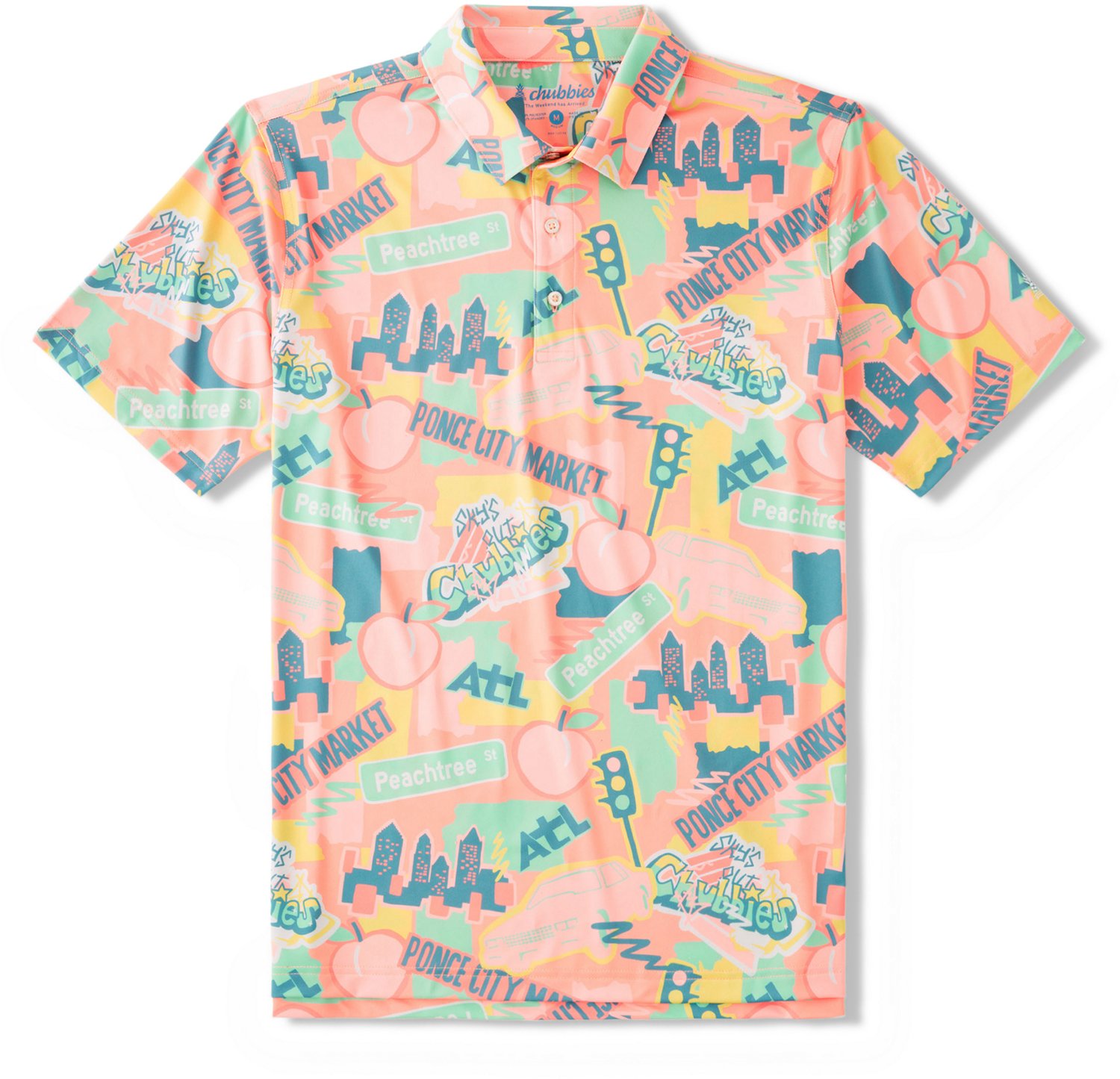 Stay comfortable from the golf course to the clubhouse in this Chubbies Men's The Traveler - Atlanta Performance Polo. It is made of 90% polyester and 10% spandex for durability and a stretch fit, and the polo is UPF 50+ rated to help protect you from UV rays.