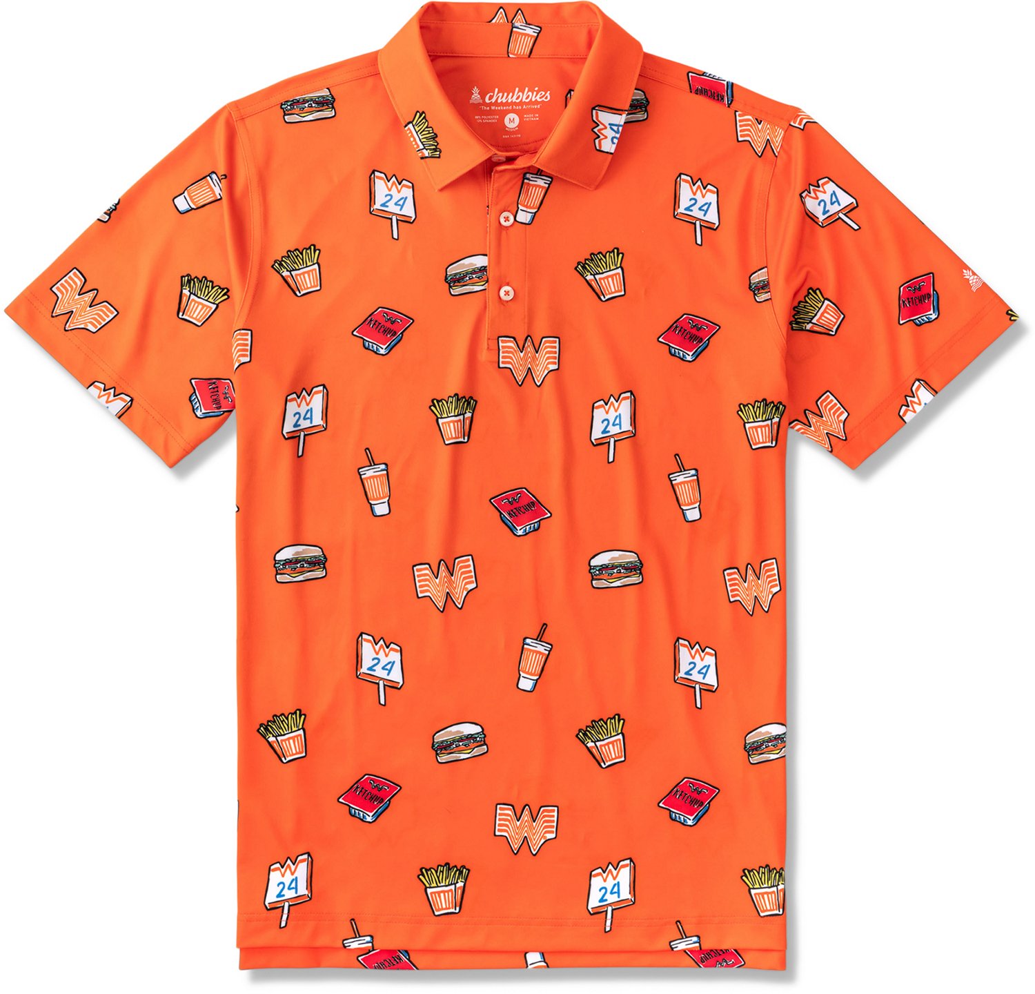 Add fun style to your wardrobe with this Chubbies Men's The Whataburger Comic Performance Polo. It is made of 90% polyester and 10% spandex for durability and a stretchy fit, and the fabric is anti-bacterial and moisture-wicking to help keep you clean and dry.