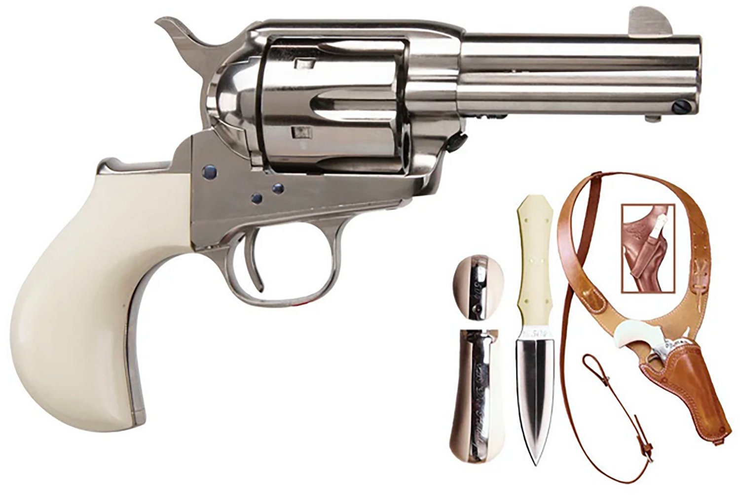 The Cimarron Doc Holiday Thunderer .45 Colt Revolver is single action and has a 6-round capacity. It's built with a rifled barrel, stainless steel frame and fixed blade front and fixed rear sights.