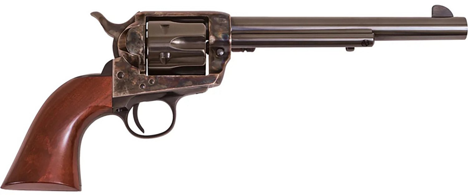The Cimarron Frontier .45 Colt Revolver is single action and has a 6-round capacity. It's built with a rifled barrel, steel frame and one-piece walnut grip. Fixed blade front and fixed rear sights and an external hammer firing system complete the design.