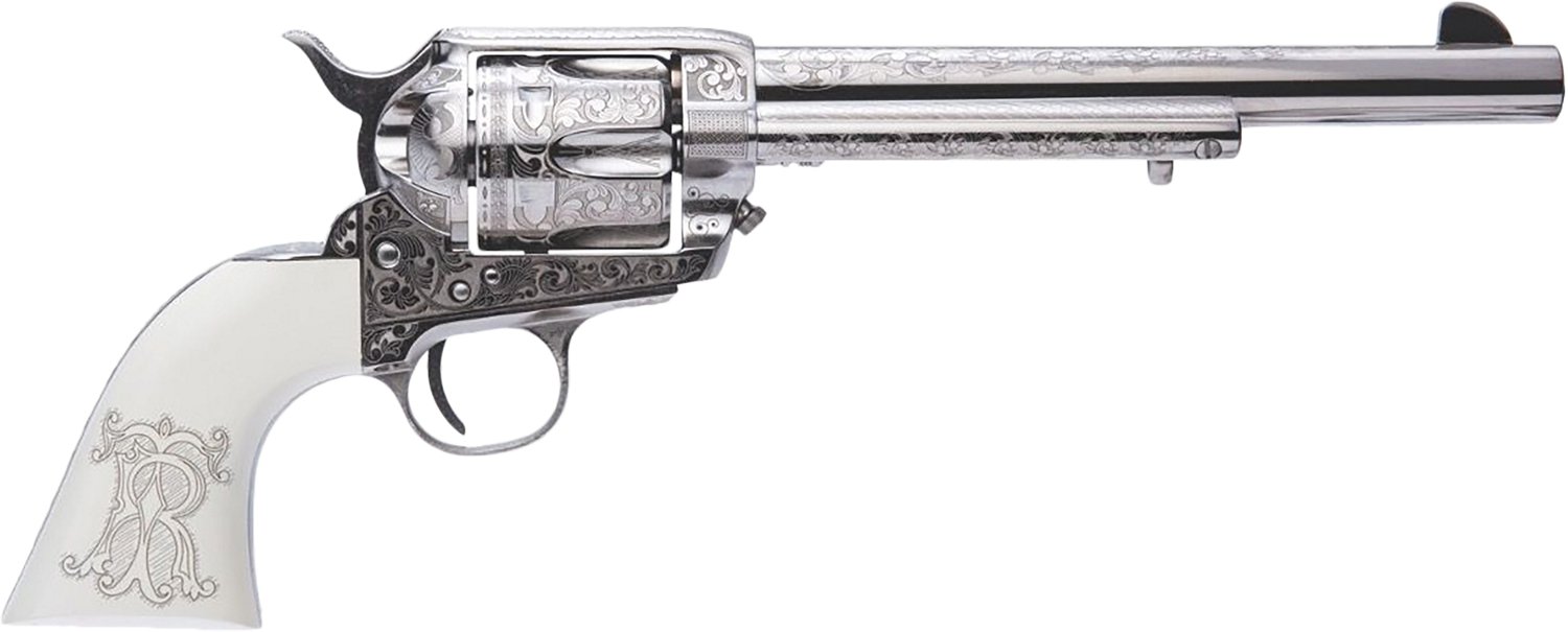 The Cimarron Frontier Teddy Roosevelt .45 Colt Revolver is single action and has a 6-round capacity. It's built with a steel frame and features a grip with laser engraved 'T.R.' initials.