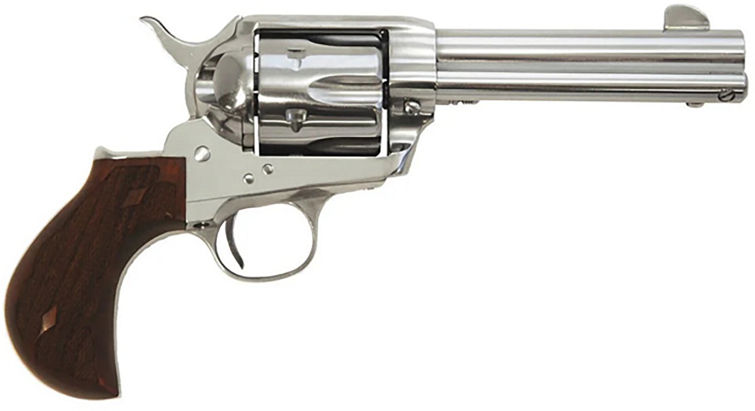 The Cimarron Thunderball .45 Colt Revolver is single action and has a 6-round capacity. It's built with a wood grip and features a stainless finish.