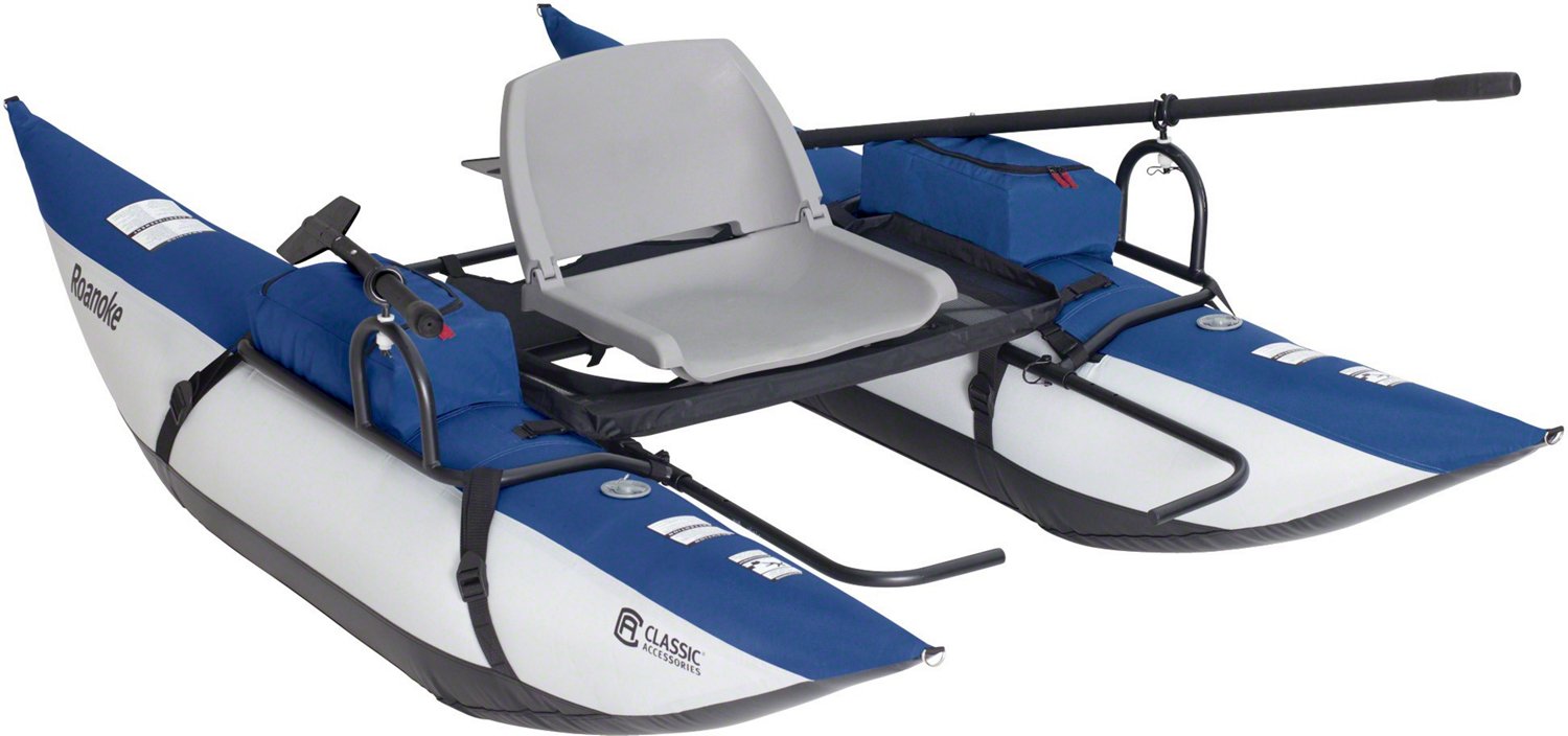 Fish all-day in the Classic Accessories Roanoke 8 ft Pontoon Boat. The bottom is crafted from PVC for abrasion resistance, and the steel tube frame and nylon top offer lasting durability. It comes with a fold-down plastic seat and nonslip footrests that adjust to fit your height. The ample storage room and the stripping apron with fish ruler are sure to come in handy out on the water.