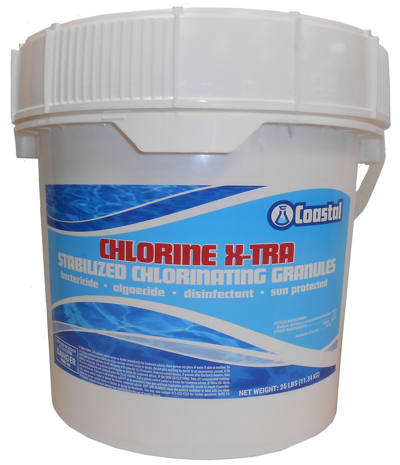 Keep your pool water clean and chlorinated with the Coastal Chlorine X-Tra 25 lb. Stabilized Chlorinating Granules, which act as a bactericide, algaecide and disinfectant and are completely soluble. Made in USA.
