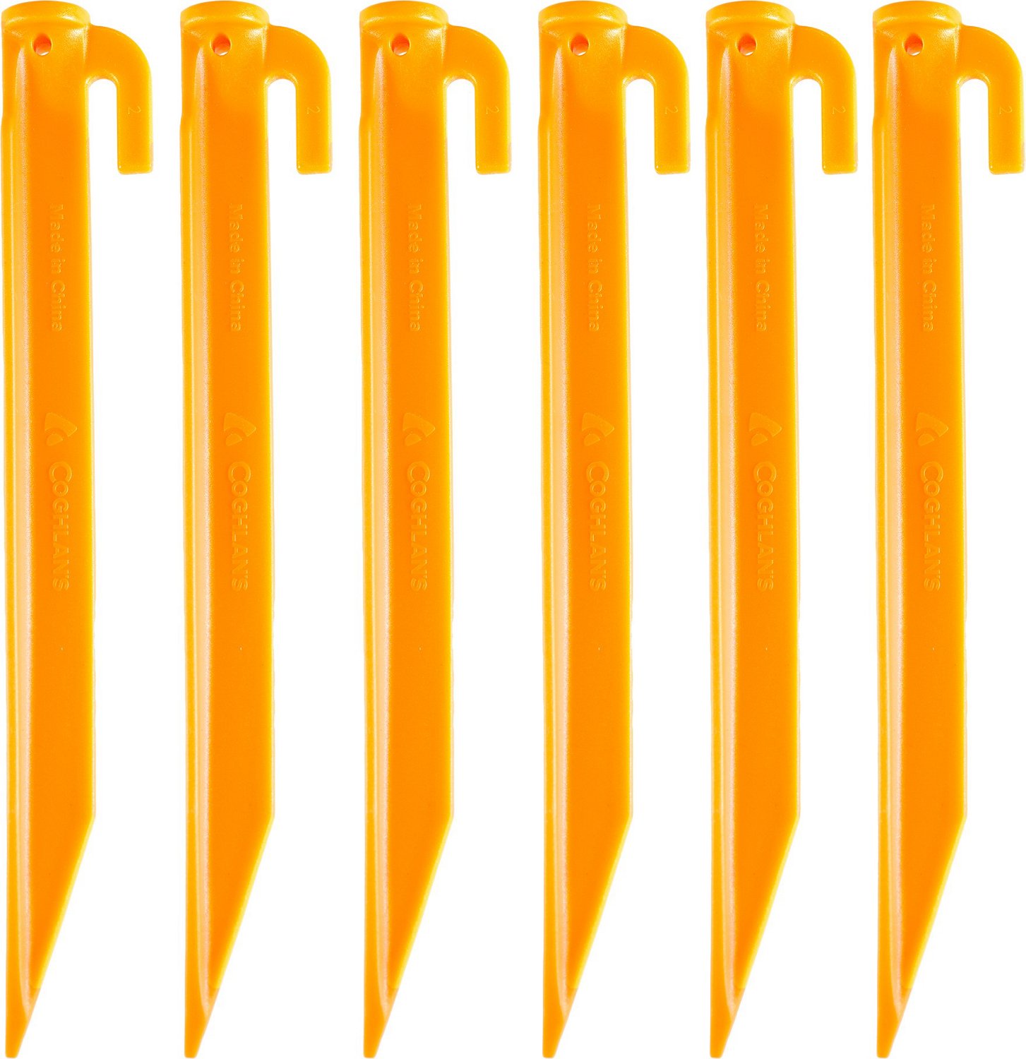 Securely stake your standard tent with the Coghlan's 9 in ABS Tent Pegs 6-Pack. The plastic construction is lightweight, durable and strong in soft or medium soil. The nonslip hook provides a secure attachment point for guy lines.