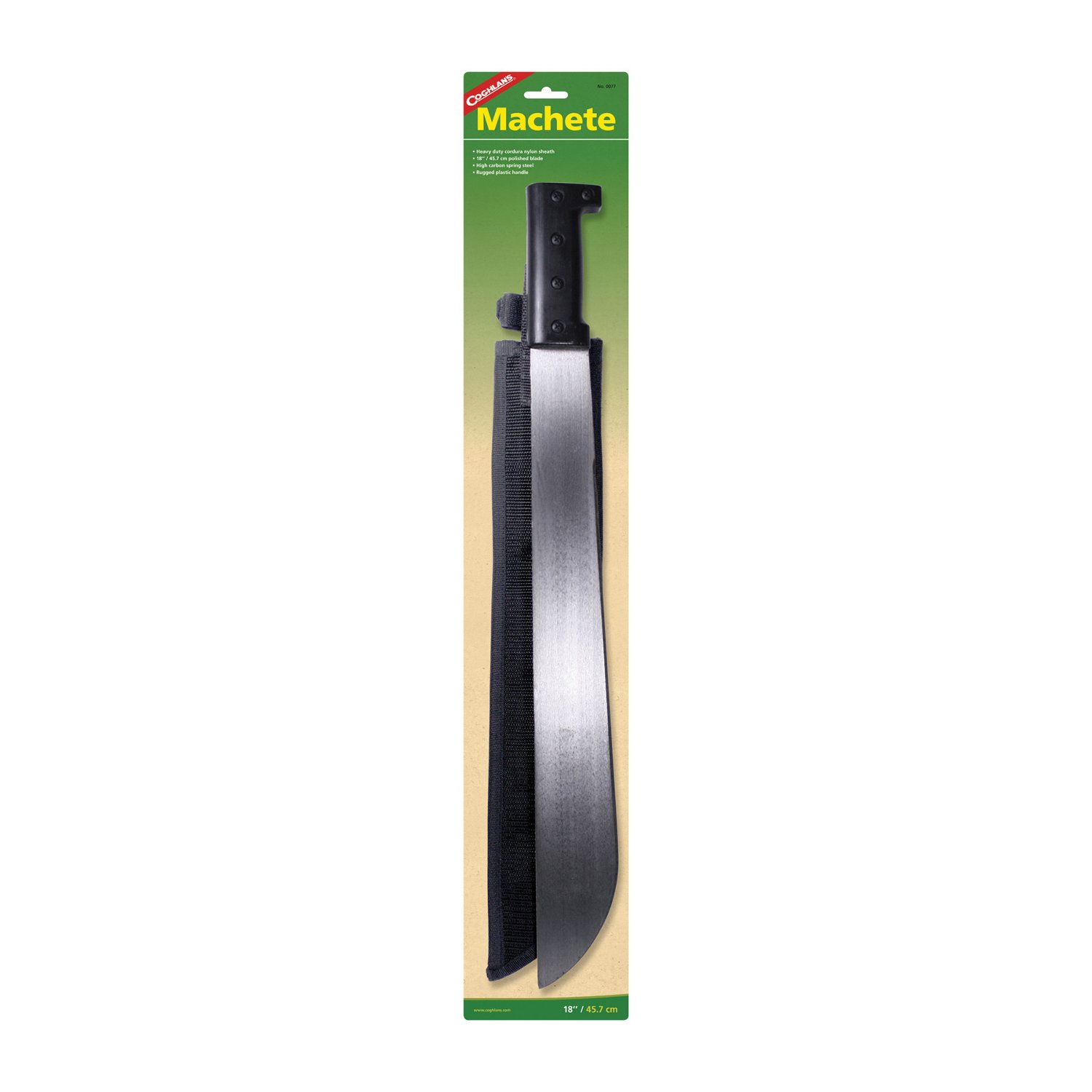 The Coghlan's Machete features a rugged, plastic handle for comfortable use and a polished, carbon steel fixed blade that can make short work of weeds and overgrowth around your yard. 18" overall length. CORDURA® nylon sheath included.