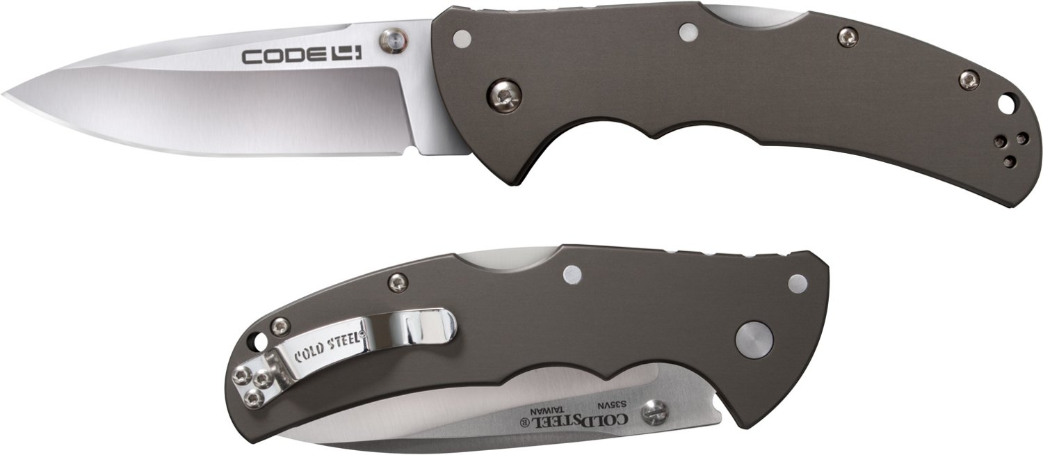 The Cold Steel Code-4 Spear Point Folding Knife is an ultra-lightweight knife designed for everyday utility. It features a hard-anodized aluminum handle with a razor-sharp S35VN folding blade. Ambidextrous thumb studs and pocket clips allow easy use with either hand, while the Tri-Ad mechanism ensures a firm lock.