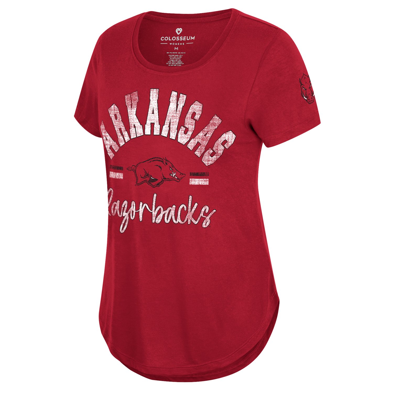 Celebrate a big win with the Colosseum Athletics Women's University of Arkansas Little? Big? Graphic T-shirt. The polyester and rayon material provides a comfortable feel, while the rounded bottom hem droptail offers coverage. The distressed screenprinted design shows off your Razorbacks pride.