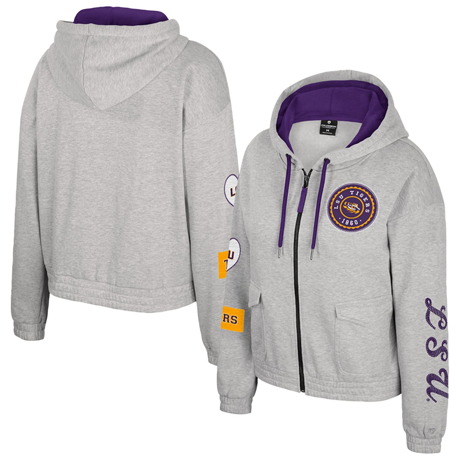 Add a layer of warmth while showing your team loyalty with this LSU Tigers Alfie Full-Zip Hoodie Jacket from Colosseum The fleece lining and midweight fabric keep you cozy while the hood is lined in a contrasting team color for a pop of team spirit Printed and embroidered team graphics showcase your LSU Tigers pride in style
