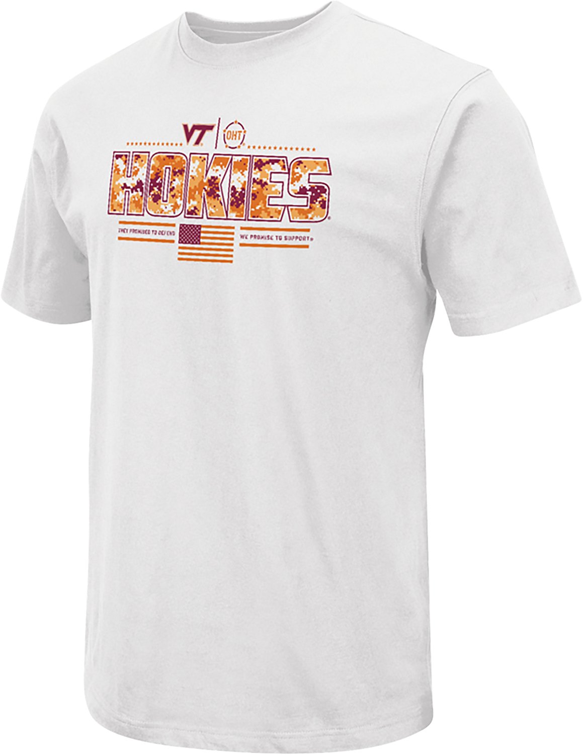 Show your support with the Colosseum Men's Virginia Tech Hokies OHT White Effect Short Sleeve T-shirt. The 100% cotton material is soft and breathable, and the Virginia Tech Hokies graphic print shows your fandom with pride.