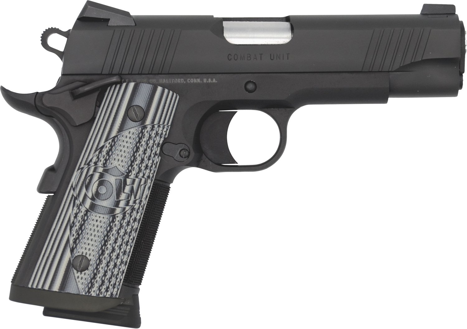 Designed to deliver accuracy and control, the Colt Commander Combat Unit 9mm Luger Pistol boasts a 4.25-inch National Match barrel and an SAO action with a 9+1-round capacity.This 9mm Luger caliber firearm is complemented with checkered and scalloped G10 grips, Novak front and rear sights and an undercut trigger guard and upswept beavertail safety.