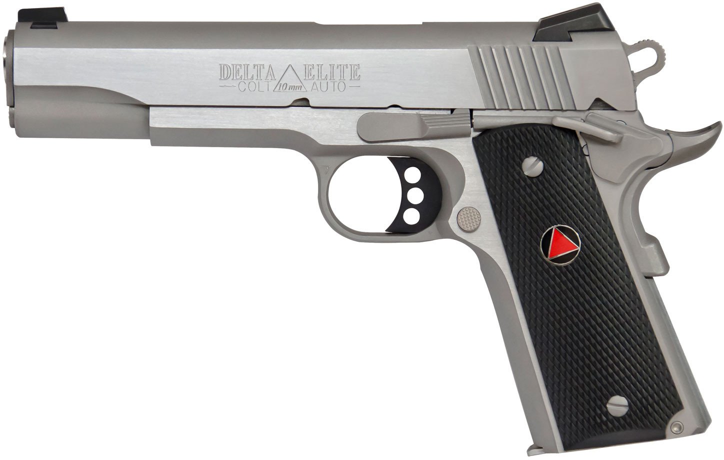 Designed with an upswept beavertail safety on the composite grip, the Colt Delta Elite 10mm Pistol has a steel frame with a 5-inch barrel and Novak sights. This semiautomatic handgun is equipped with a series 80 firing pin safety, an extended thumb safety and a skeletonized hammer.