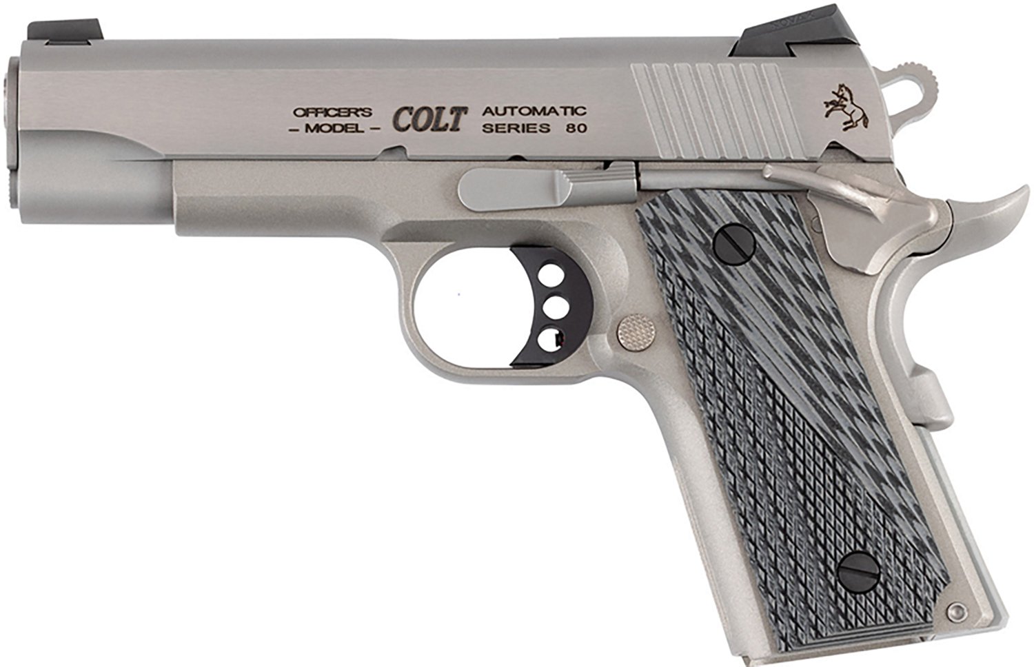 Arm yourself with the Colt Lightweight Officers Model .45 ACP Semiautomatic Pistol. It is semiautomatic with a 7-round capacity. The barrel with a stainless cerakote finish is 4.25-inches long, and it is equipped with an aluminum frame. The gray/black G10 grip finishes off the design.