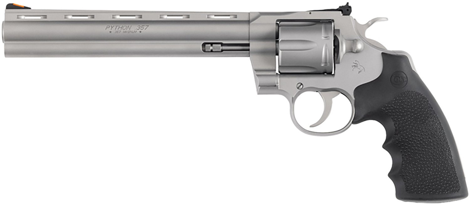 The Colt Python .357 Magnum/.38 Special Revolver boasts single/double action and has a 6-round capacity. It's built with a steel frame, Hogue grip and red ramp front and adjustable rear sights.