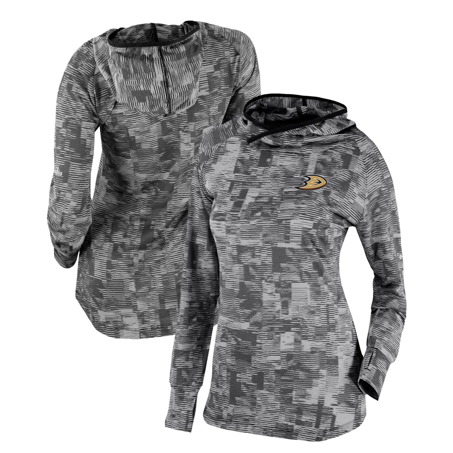 The Women's Columbia Black Anaheim Ducks Omni-Wick Sunday Ball Pullover Hoodie is the perfect way to show your support for the Anaheim Ducks Made from lightweight polyester this hoodie is ideal for mild temperatures and features a scuba neck thumb holes and heat-sealed graphics that proudly display your Ducks pride Whether you're cheering from the stands or relaxing at home this hoodie will keep you comfortable and stylish