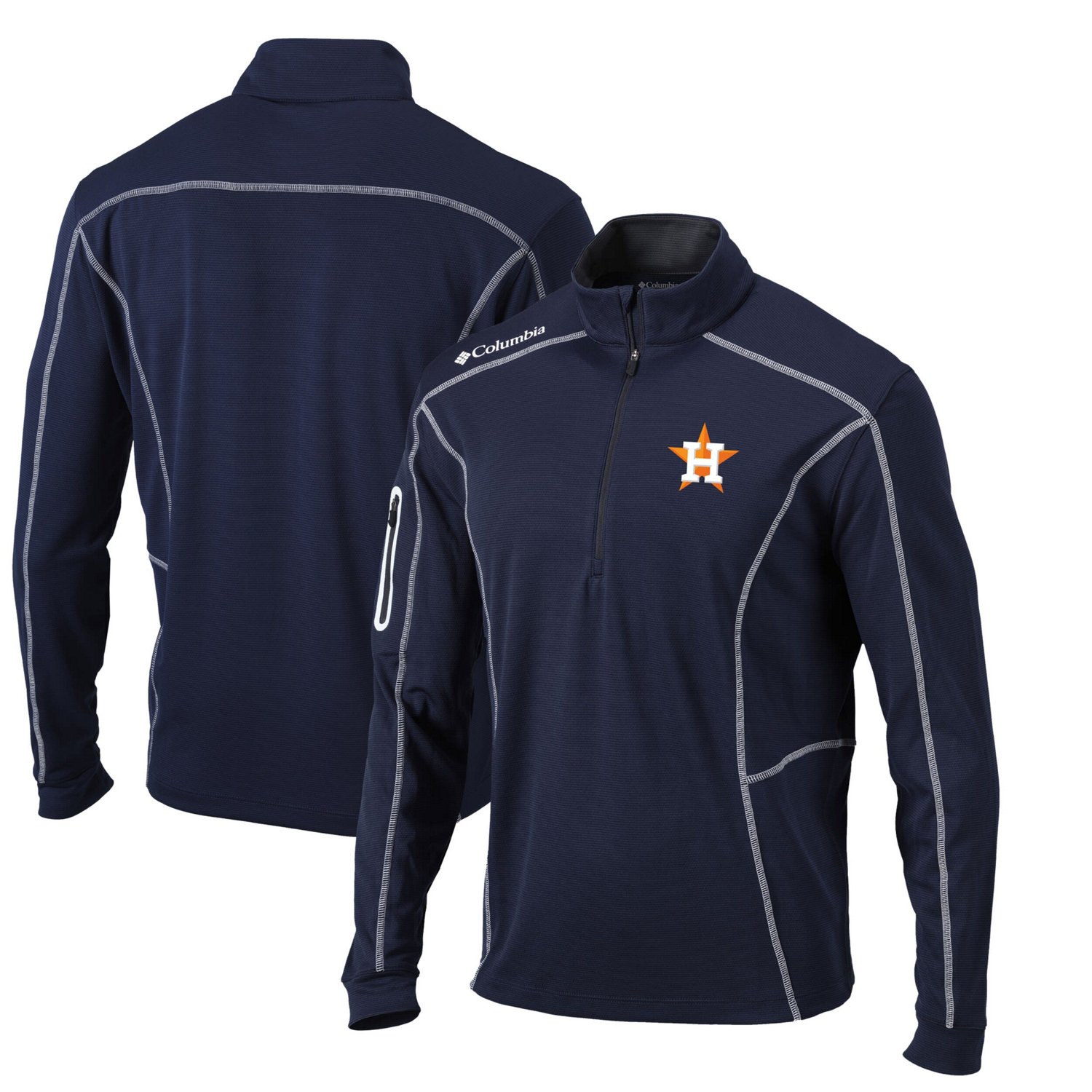 The Men's Columbia Navy Houston Astros Omni-Wick Shotgun Quarter-Zip Pullover Top is the perfect way to show your support for the Houston Astros Made of lightweight polyester this top is ideal for mild temperatures and features Omni-Wick technology to keep you dry and comfortable The embroidered Houston Astros graphics and vertical zippered sleeve pocket add a touch of style while the flatlock stitching ensures durability Whether you're cheering on the Astros at the stadium or just showing your team spirit this top is a must-have for any fan