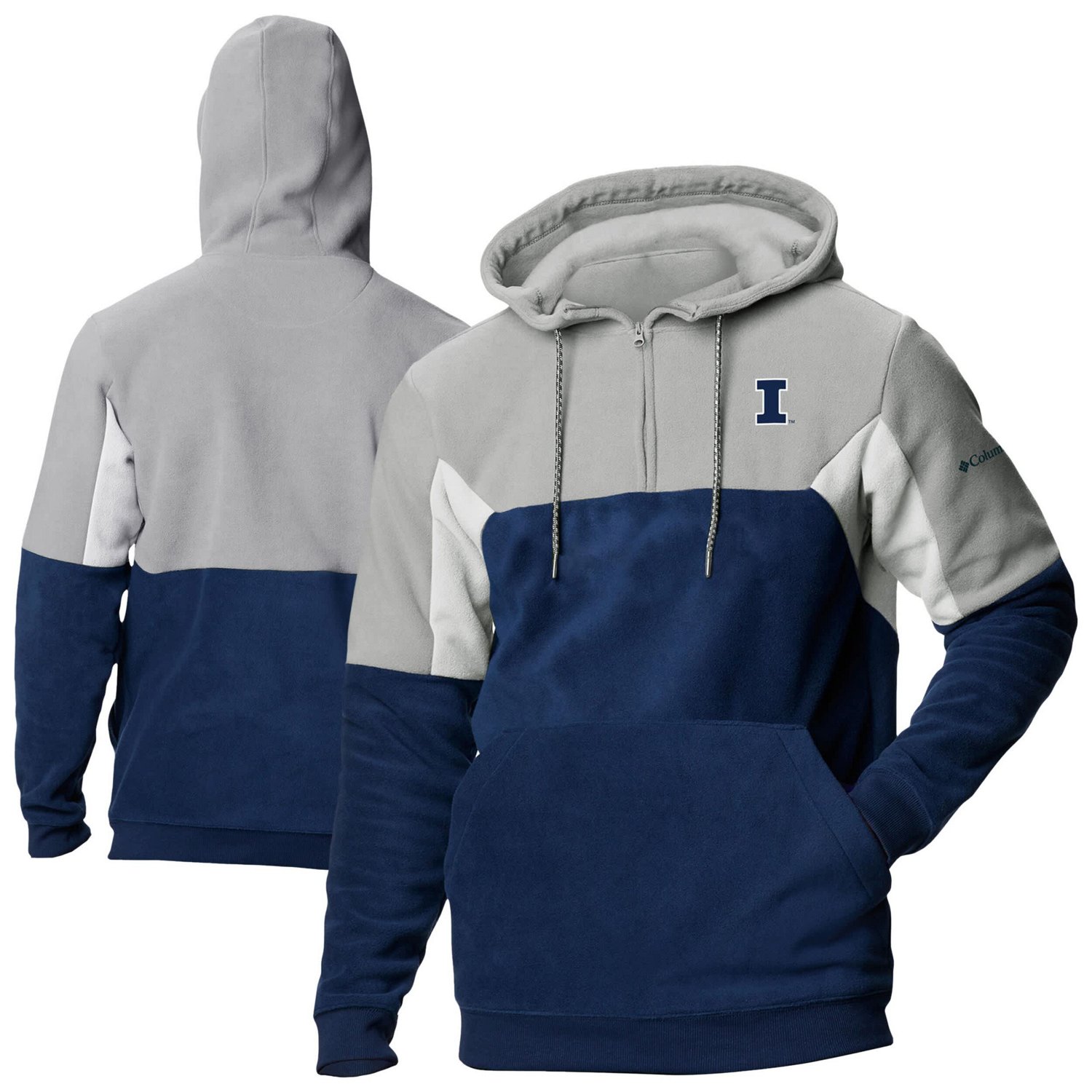 Zipper up when the temperature drops at the next Illinois Fighting Illini game with this Columbia Lodge Fleece Pullover Hoodie This quarter-zip features a unique color-contrasting panel design at the chest and top of the sleeves adding a stylish touch to your team wardrobe The adjustable drawstring hoodie allows for full coverage from the elements while the polyester-fleece fabric provides extra comfort and warmth making it perfect for cheering on the Illinois Fighting Illini during those chilly game day kickoffs