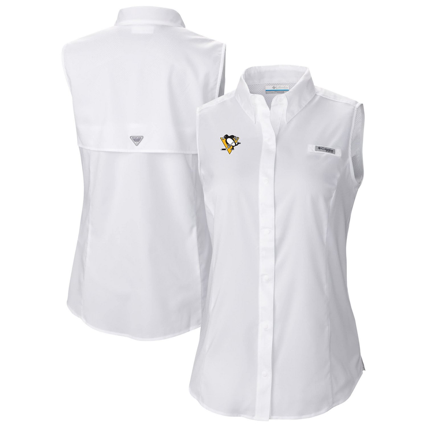 Stay cool and show your Pittsburgh Penguins pride with this Columbia Tamiami Omni-Shade Sleeveless Button-Up Shirt This breathable 100 polyester shirt features a vented design and curved hemline for a flattering and comfortable fit Plus with built-in Omni-Shade technology it provides UPF 40 sun protection to keep you cool and shielded from harmful UV rays