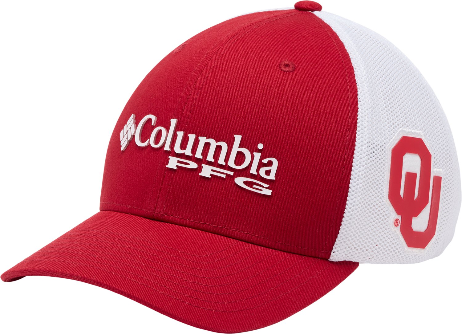 Show your team spirit with the Columbia Sportswear Adults' Oklahoma Sooners PFG Mesh Ball Cap. It is made of 100% cotton. The Flexfit provides a comfortable wear, and its sonic weld school logo is on the side. It's official Oklahoma Sooners merch.