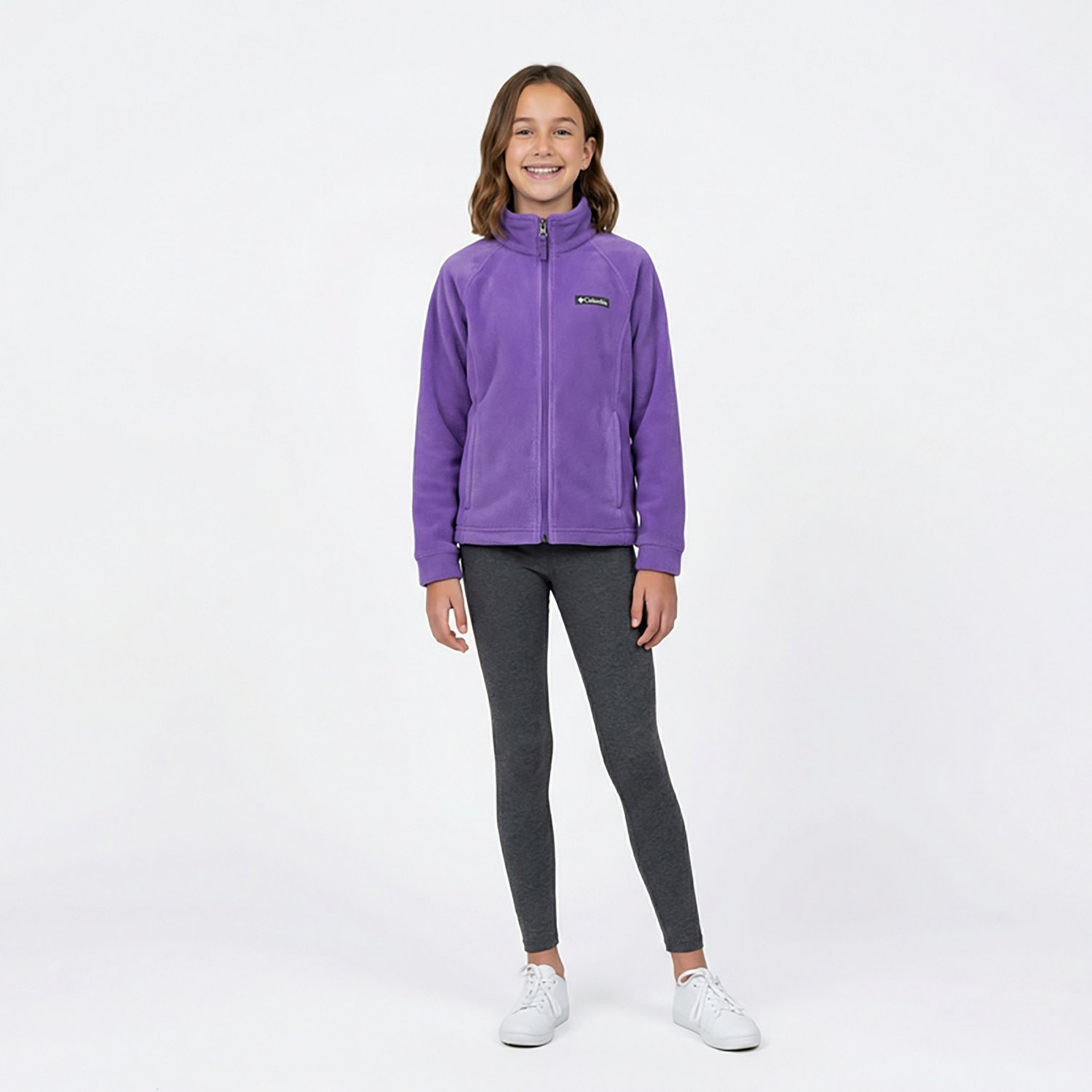 She can keep warm on the ski slopes in the Columbia Sportswearâ„¢ Girls' Benton Springsâ„¢ Fleece Jacket, which is made of soft 100% polyester MTR filament fleece for comfort and warmth. The jacket features a raglan design, a mock neck, a full-zipper closure and zippered hand pockets. Columbia Sportswearâ„¢ logo on the upper left chest. Modern classic silhouette.