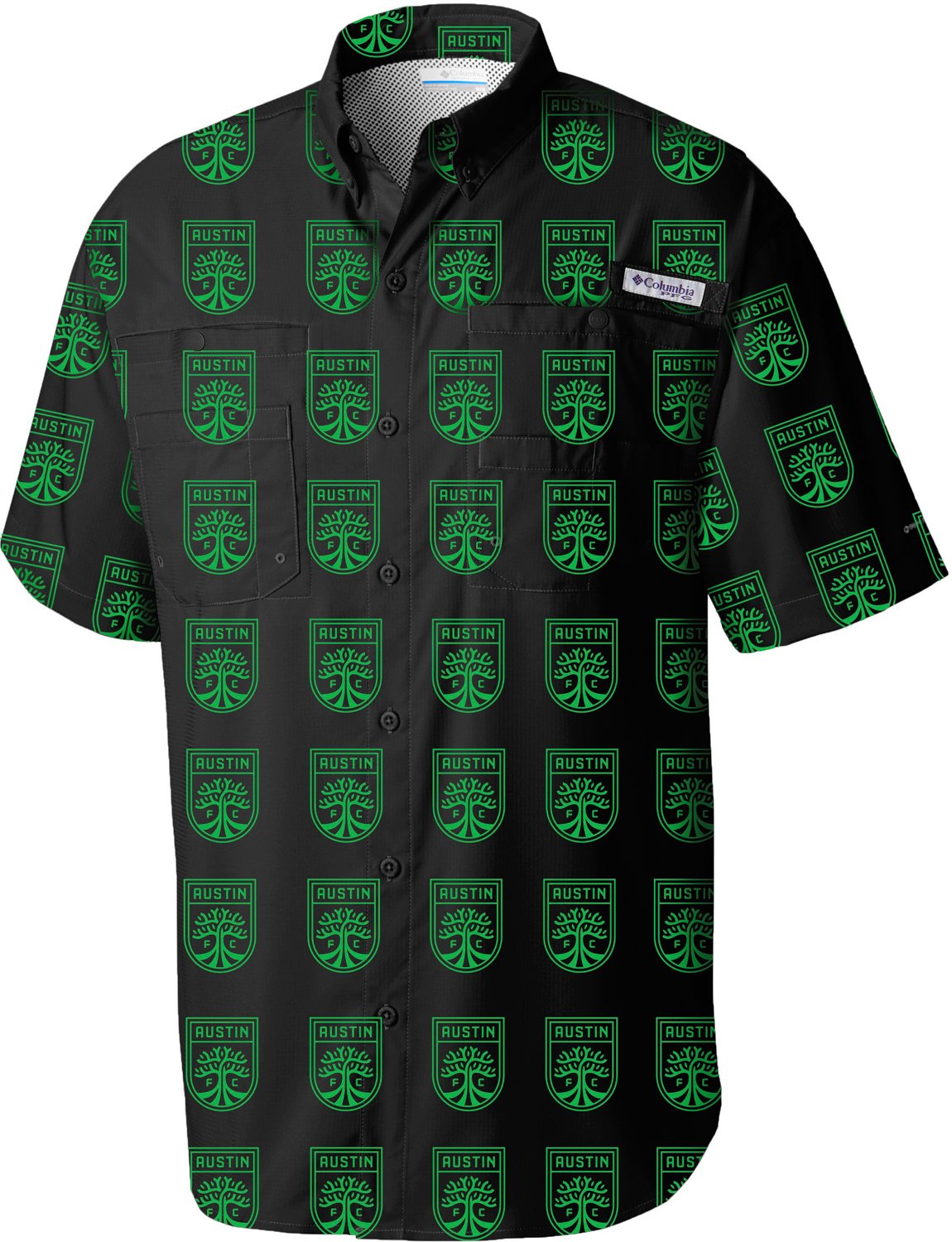 Show your love for your team in the Columbia Sportswear Men's Austin FC Sublimated Tamiami Button Down Shirt. This button down is made from 100% polyester for comfort and durability and has an allover Austin FC crest print that shows your team spirit.