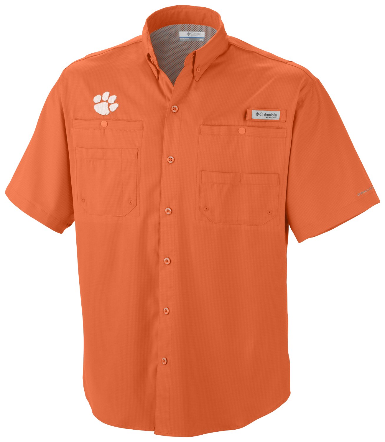 Featuring Omni-Wick™ fabric technology and vented construction, the Columbia Sportswear™ Men's Clemson University Tamiami™ Short Sleeve Fishing Shirt helps keep you dry. This shirt is made of 100% polyester ripstop for comfortable wear and has Omni-Shade™ UPF 40 sun protection against harmful UV rays. Multiple chest pockets. Rod holder. Modern classic fit.