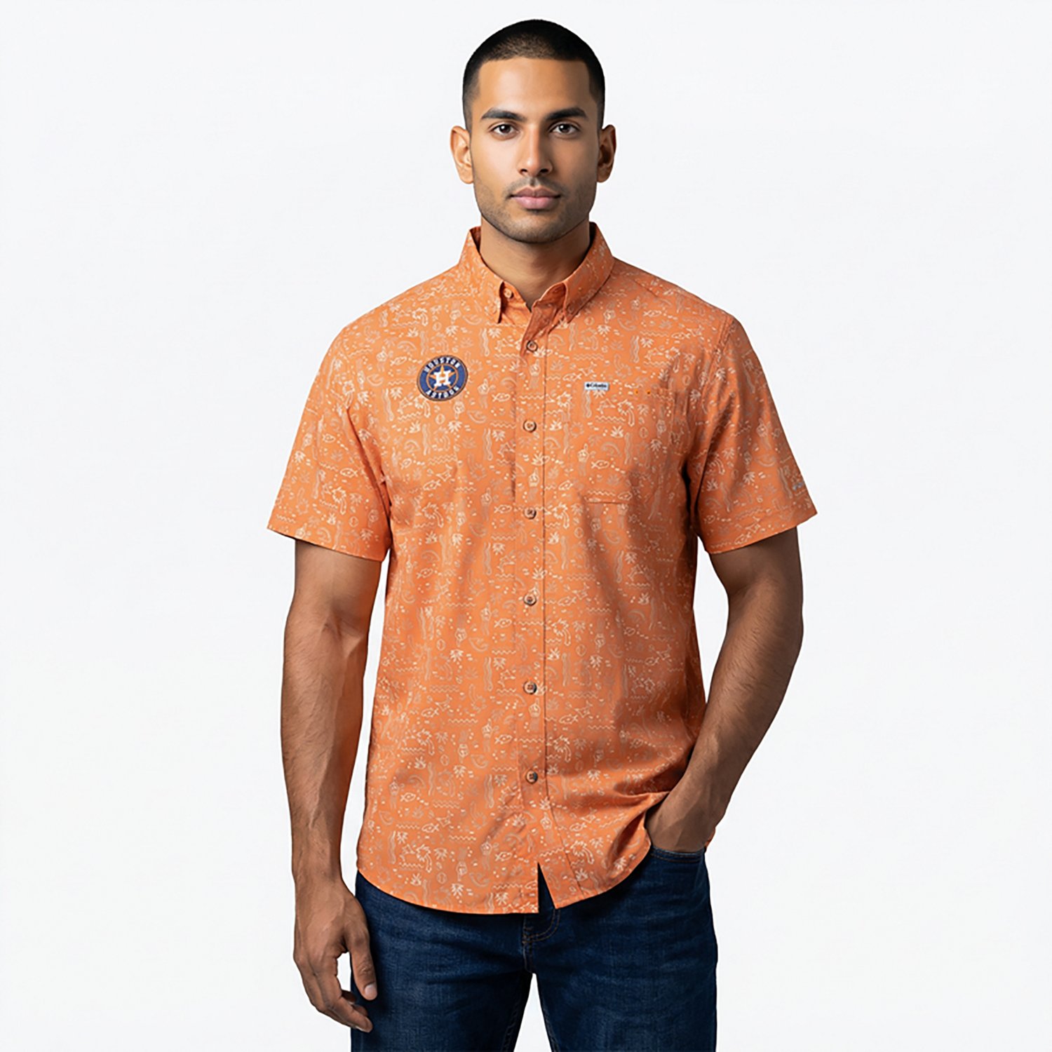 Columbia Sportswear Men's Houston Astros Fish Fan Print Super Slack Tide Button Down Shirt