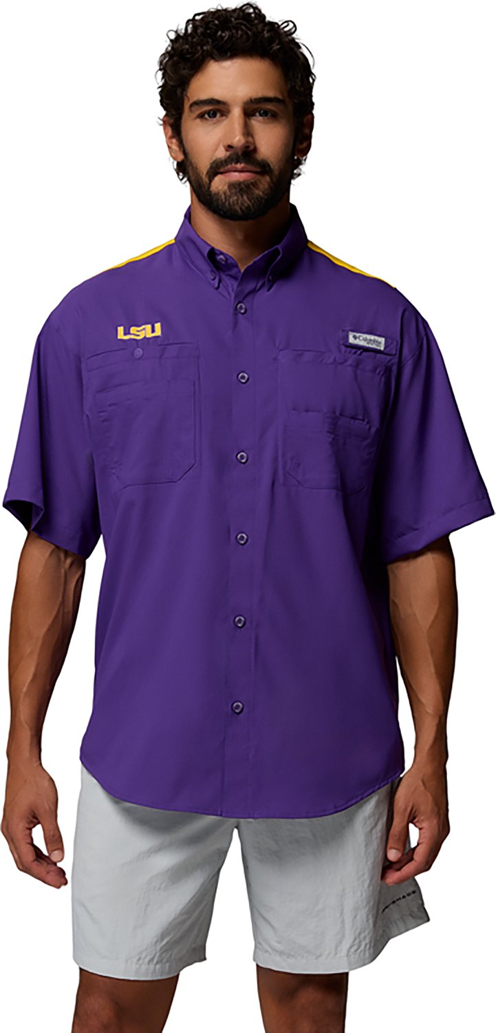 Gear up for game day with the Columbia Sportswear Men's Louisiana State University CLG Tamiami Colorblock Button-Up Shirt. The polyester material provides a comfortable feel, while the Omni-Wick technology helps keep you cool and dry. Built-in Omni-Shade UPF 40 sun protection shields against harmful UV rays, and the screen-printed logo shows off your Tigers pride.