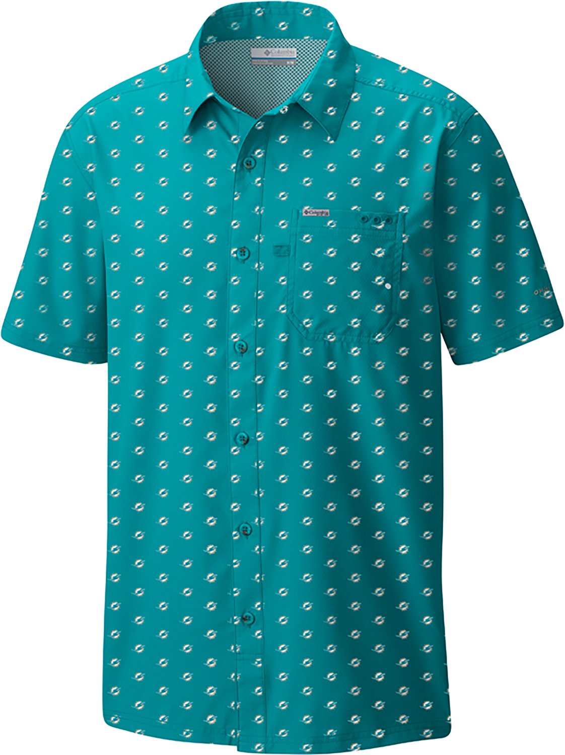 Show your support while staying cool and stylish with the Columbia Sportswear Men's Miami Dolphins Super Slack Tide Micro Print Short Sleeve Shirt. The Omni-Wick™ fabric draws sweat away from your skin to keep you cool and dry, and the Omni-Shade™ material helps protect from harmful UV rays.