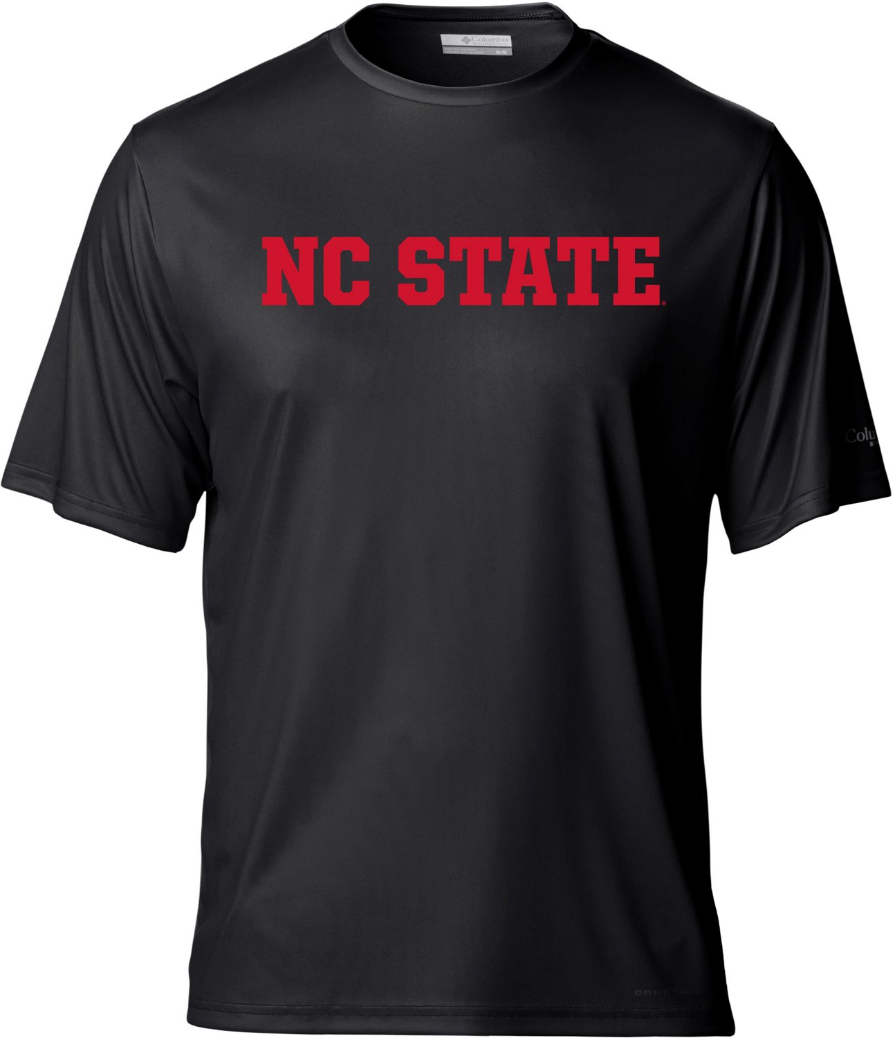 Cheer on the Wolfpack in the Columbia Sportswear Men's North Carolina State University Terminal Tackle Short Sleeve T-shirt. This T-shirt is made from quick-drying polyester for durability and has Omni-WICK™ technology that wicks sweat to keep you cool and dry. The UPF 50 sun protection guards against harmful UV rays, while the NC State team graphics on the front and back show your team spirit.