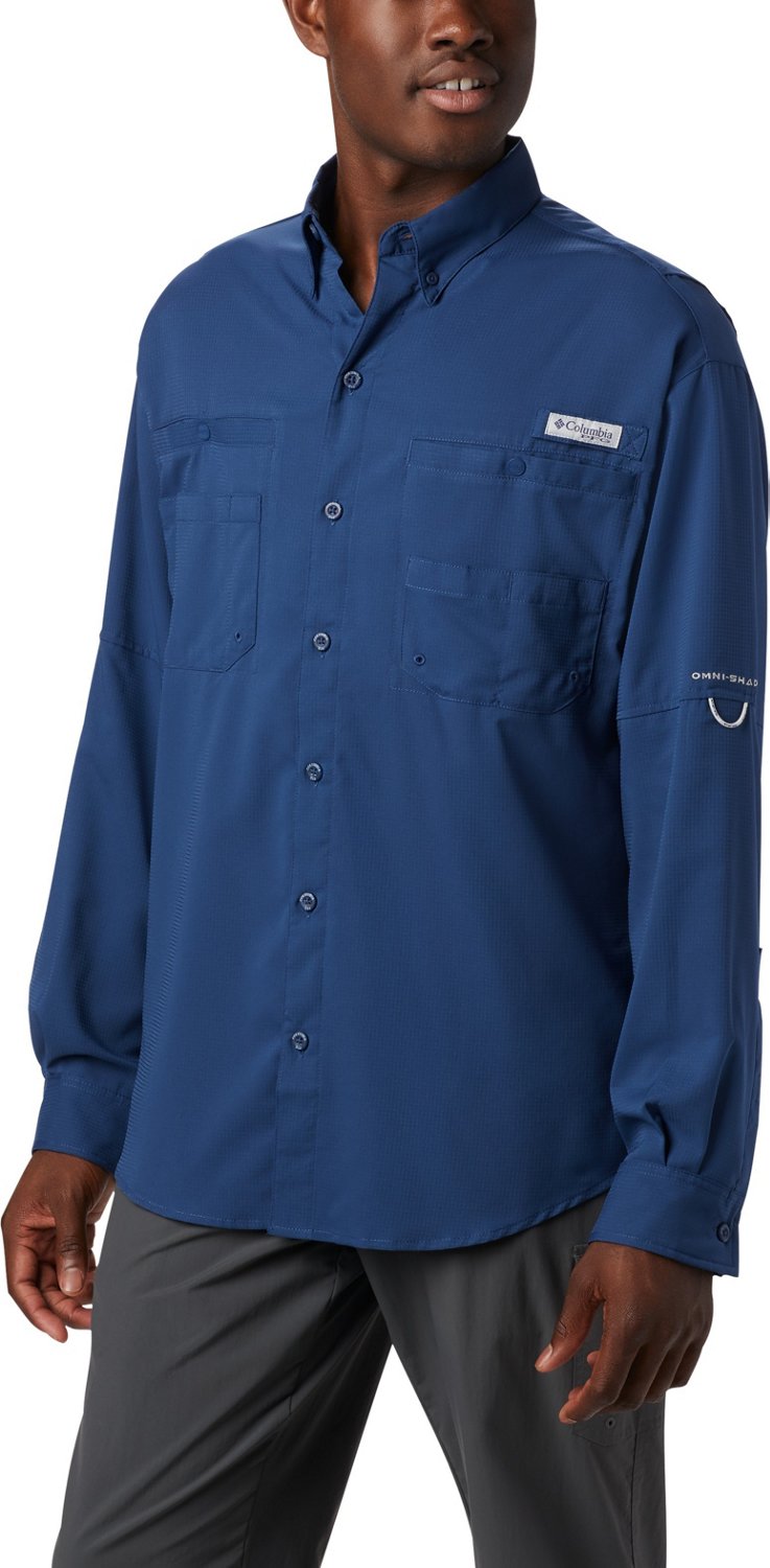 The Columbia Sportswear Men's PFG Tamiami II Long Sleeve Shirt features deep chest pockets and a rod holder and is made from polyester with mechanical stretch to accommodate a large range of motion when casting. Antimicrobial. Long sleeves.