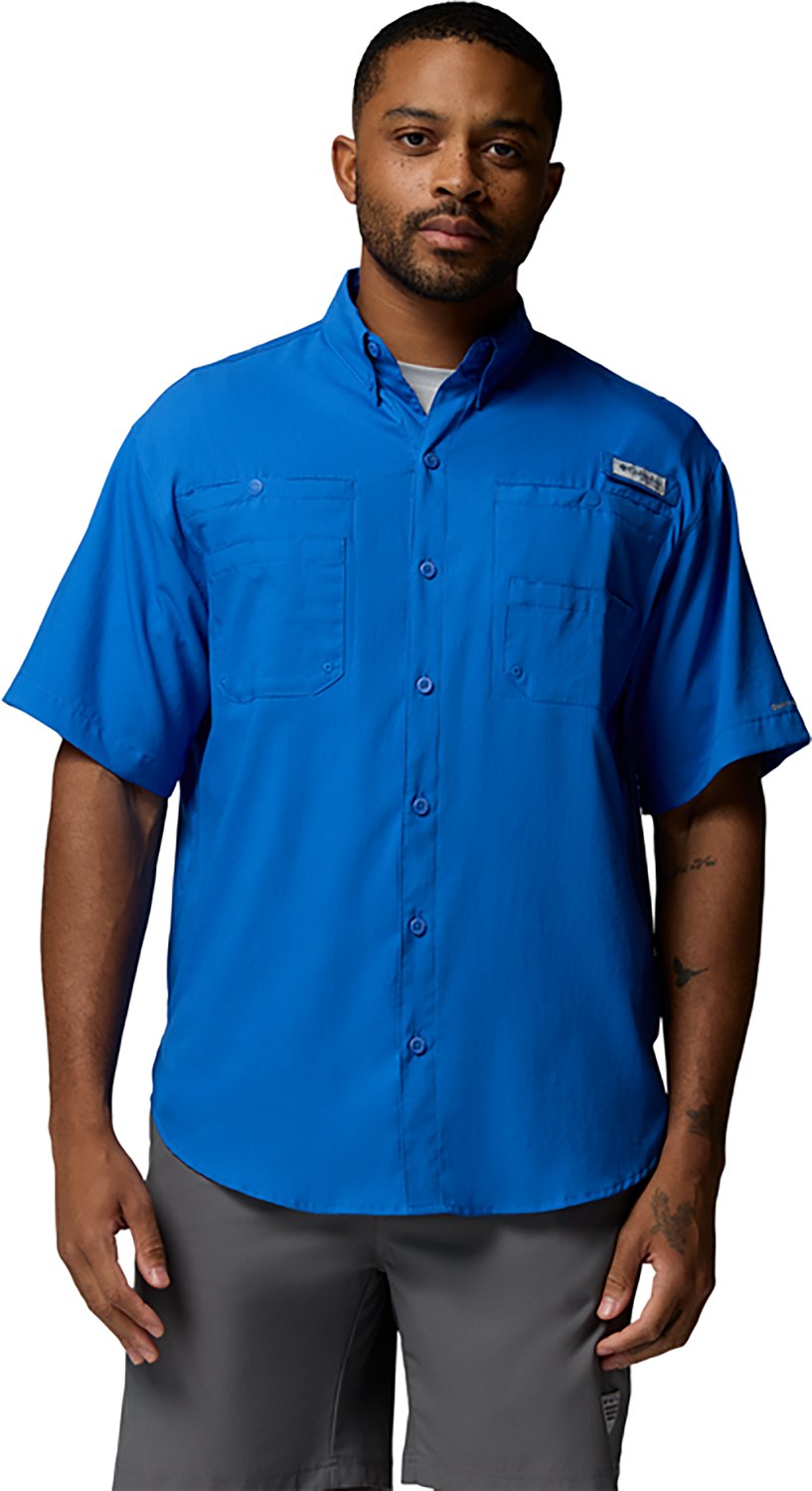 The Columbia Sportswear Men's PFG Tamiami II Short Sleeve Shirt features deep chest pockets and a rod holder and is made of 100% polyester with mechanical stretch construction to accommodate a large range of motion when casting. Omni-Shadeâ„¢ and Omni-Dryâ„¢ technologies provide sun protection and dry wear, and mesh-lined cape vents offer breathability. Antimicrobial performance. Short sleeves.