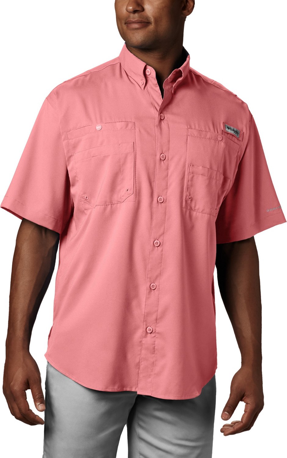 The Columbia Sportswear Men's PFG Tamiami II Short Sleeve Shirt features deep chest pockets and a rod holder and is made of 100% polyester with mechanical stretch construction to accommodate a large range of motion when casting. Omni-Shadeâ„¢ and Omni-Dryâ„¢ technologies provide sun protection and dry wear, and mesh-lined cape vents offer breathability. Antimicrobial performance. Short sleeves.