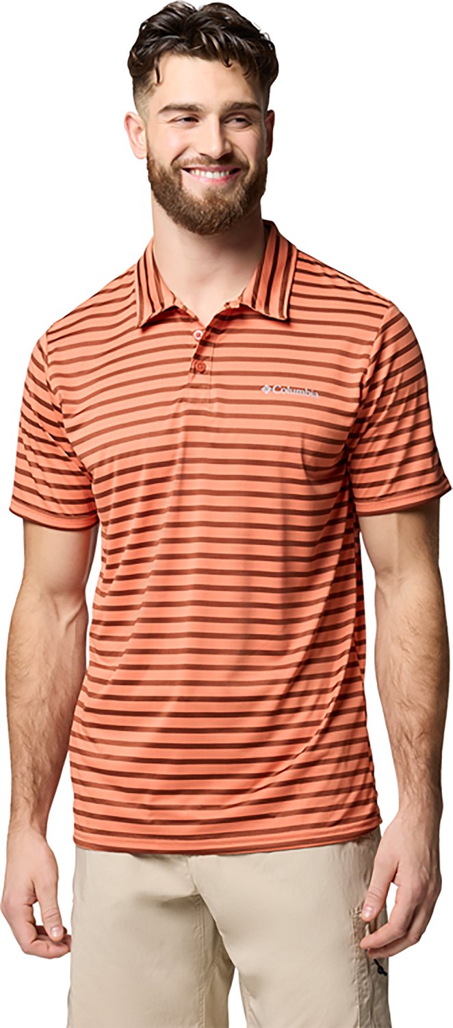 Look your best in the Columbia Sportswear Men's Striped Polo Shirt. It is made of 100% polyester. The Omni-Wick technology wicks away moisture and dries quickly, and its buttoned collar adds a layer of sophistication. The striped design provides eye-catching detail.