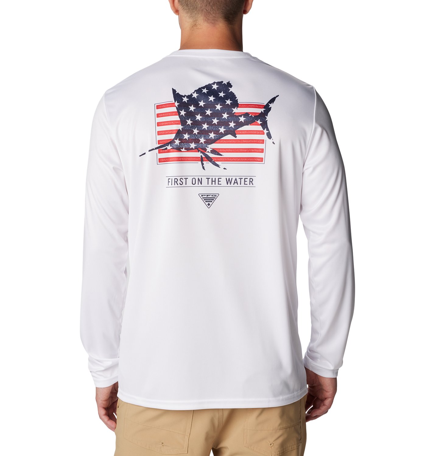 Wear the Columbia Sportswear Men's Terminal Tackle PFG Fins and Stripes Long Sleeve T-Shirt for sun protection and comfort on long days on the boat. Made of 100% polyester, this T-shirt comes with a unique screenprinted graphic on the chest for a touch of style.
