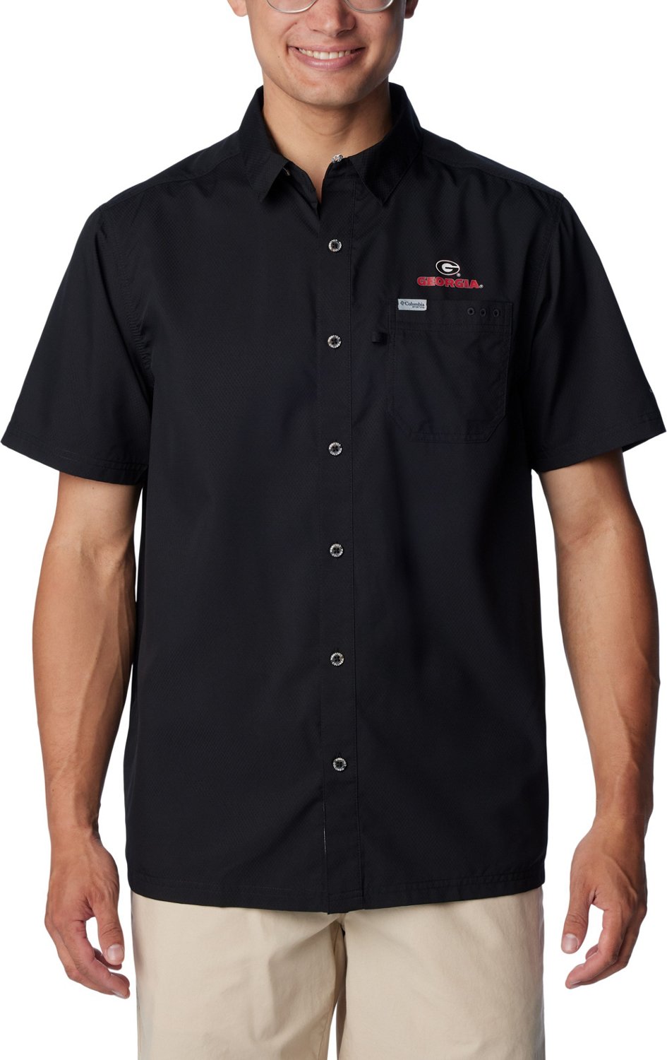 Sport the Columbia Sportswear Men's University of Georgia PFG Slack Tide Camp Button Down Shirt to show off your Bulldogs pride. Made of 100% polyester for durability, this shirt comes with sweat-wicking material and Omni-Shade UPF 50 sun protection for comfortable wear. The shirt also features a screen-printed team graphic on the front for a touch of style.