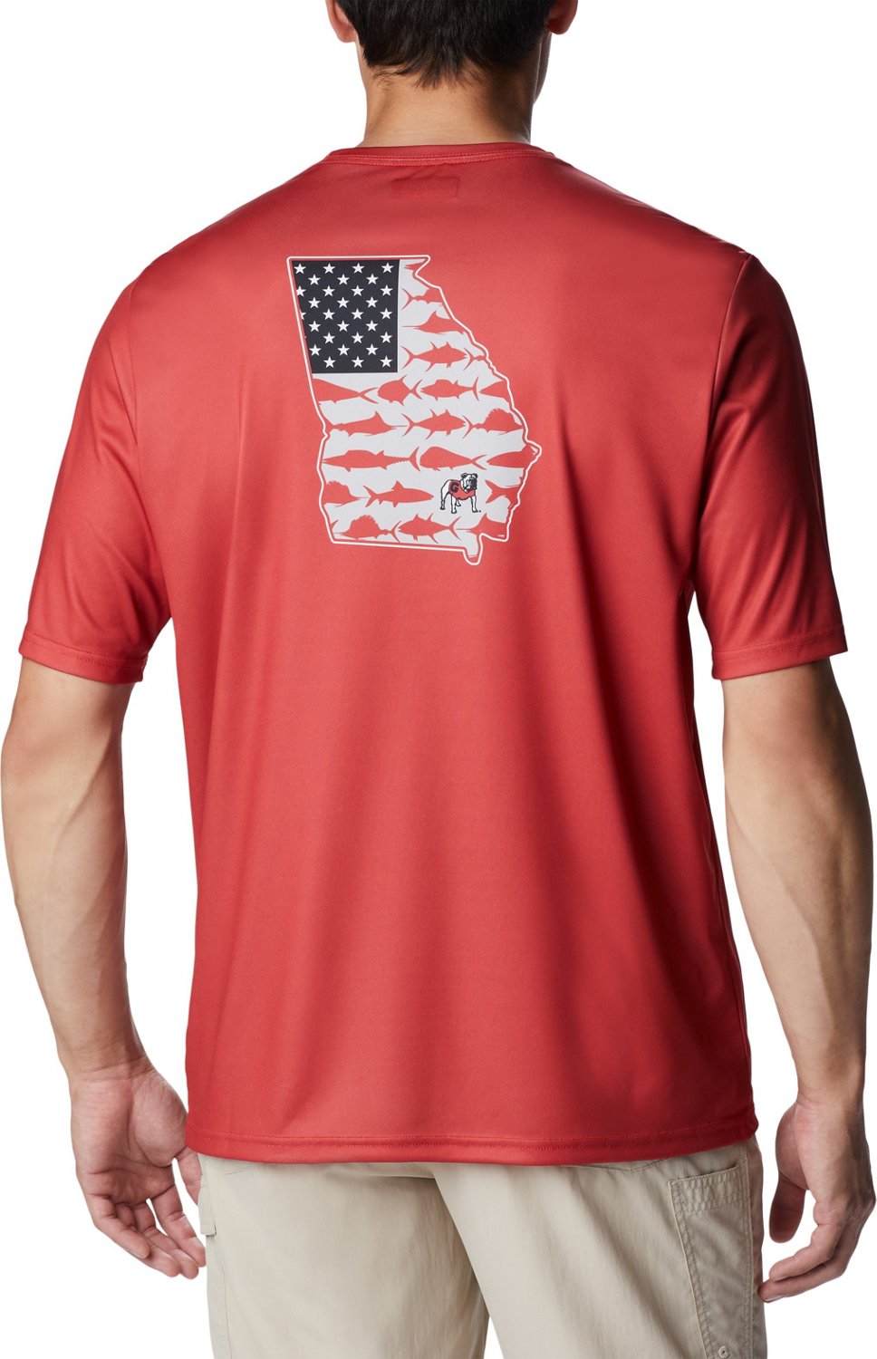 Show your Bulldogs pride in comfort with the Columbia Sportswear Men's University of Georgia Terminal Tackle Flag Graphic Short Sleeve T-shirt. The cotton construction provides comfort that lasts the entire day, while the 50 UPF rating protects you from the sun. The bulldogs design highlights you support for the team.
