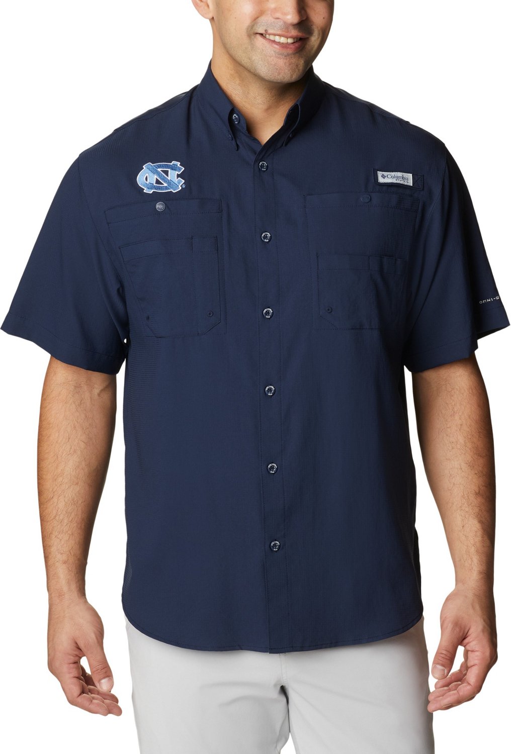 Show your team spirit while wearing the Columbia Sportswear™ Men's University of North Carolina Tamiami™ II Short Sleeve Shirt, which features a school logo on the right chest. This button-down shirt is made of 100% polyester ripstop with Omni-Wick™ technology to help keep you dry and Omni-Shade™ technology that provides UPF 40 sun protection against harmful UV rays. Antimicrobial to help keep you feeling fresh. 2 pockets. Modern Classic fit.